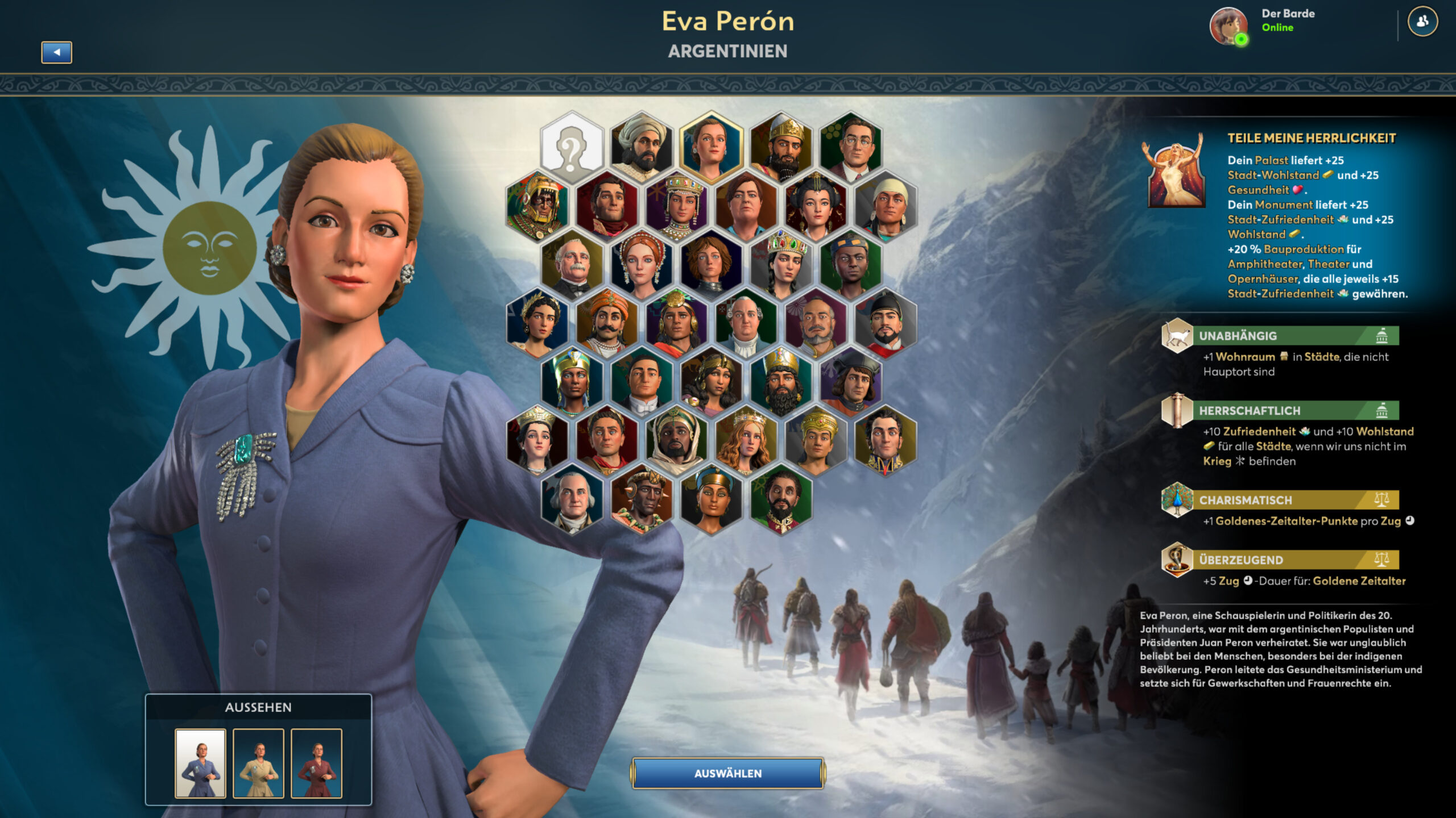 Bei den Anführern gibt es bereits einige Überraschungen. Natürlich gibt es bekannte Gesichter des historischen Who-is-Who politischer Persönlichkeiten. Julius Cäsar, George Washington, Otto von Bismarck, Isabella I. und Tokugawa sind fast schon alte Bekannte. Es gibt aber auch Auswahlmöglichkeiten die historisch keine Anführer waren. Der polnische Astronom Nikolaus Kopernikus, die Lyrikerin Sappho aus dem antiken Griechenland oder sogar Hildegart von Bingen aus der Deluxe Edition haben mich dann deutlich mehr überrascht. Argentinien dürft ihr sogar mit der damals politisch sehr engagierten Schauspielerin Eva Perón anführen.