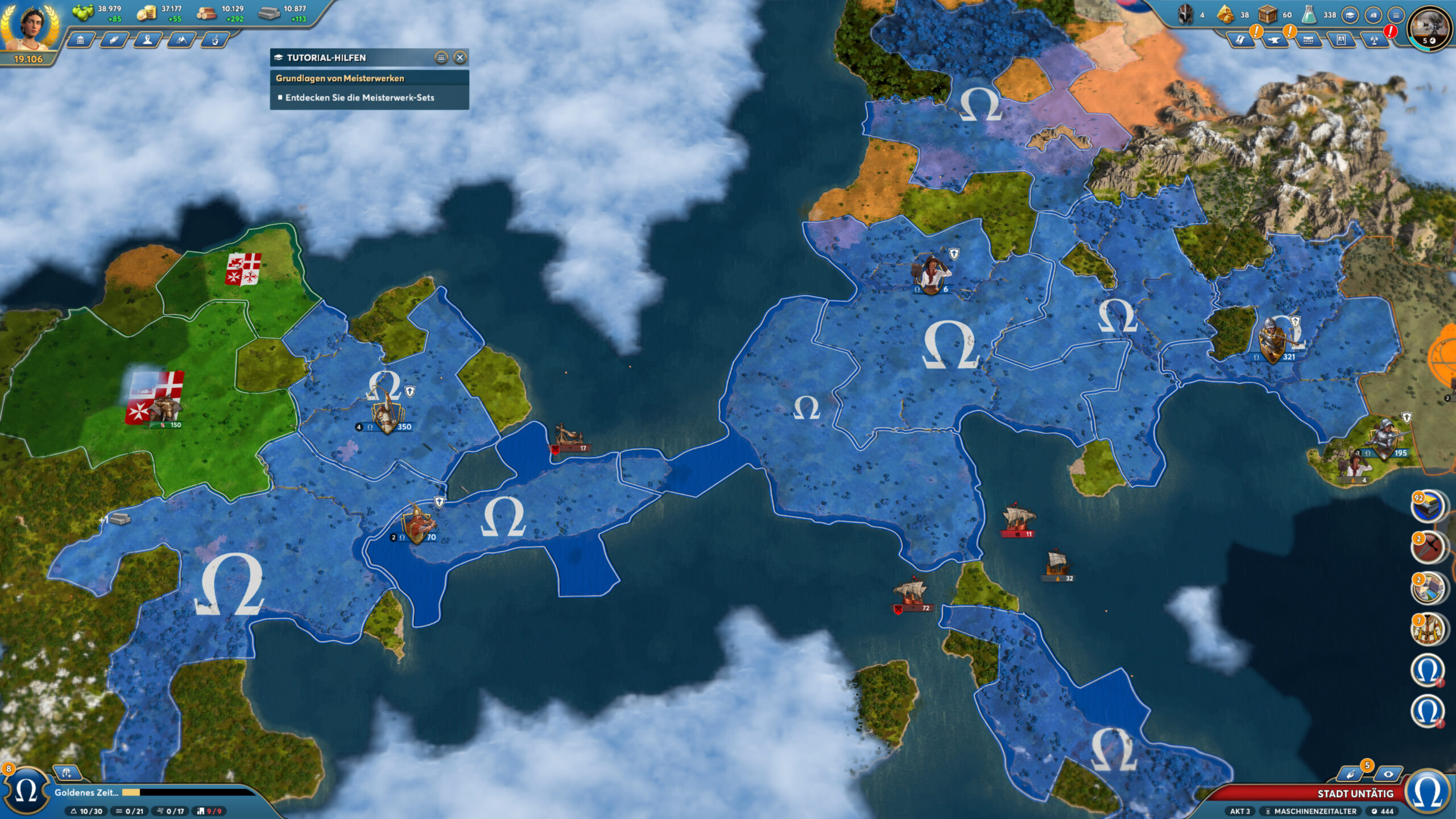 Wo Ara: History Untold gegenüber der Konkurrenz eindeutig punktet ist die Optik – zumindest auf den ersten Blick. Mich hat schon lange gestört, dass Städte in Civilization auf der Karte viel zu klein wirken. Darum lohnt sich Ara: History Untold optisch schon allein für die Städte, die sich herrlich auf ihrem immer größer werdenden Einflussgebiet ausdehnen.