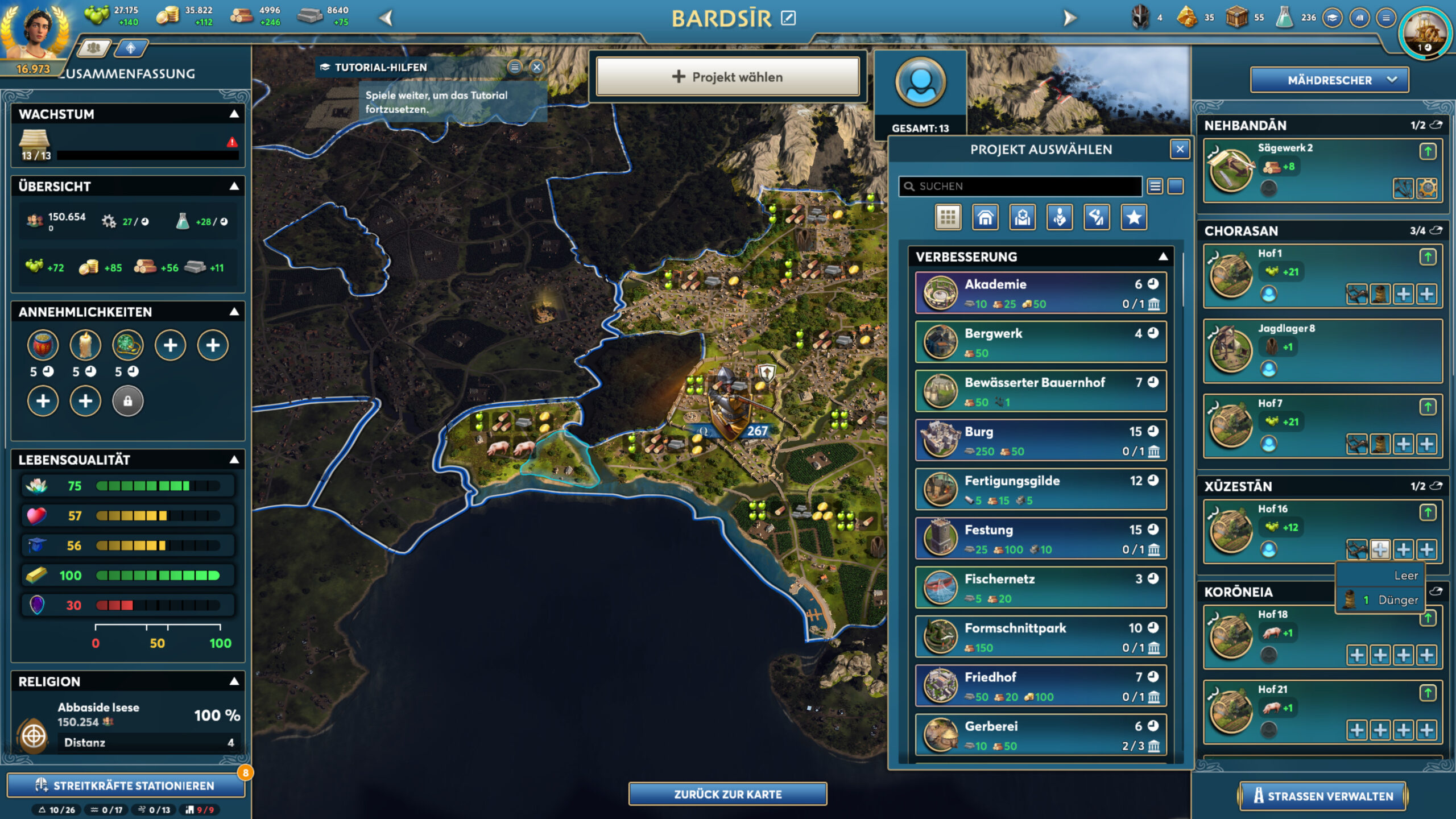 Dabei verzichtet das Spiel auf einen Baumeister und lässt euch stattdessen alles über die Stadt bauen. Dabei kommen auch wieder die Regionen zum tragen. Jede Region besteht aus 2 bis 5 Zonen, die jeweils mit einem Gebäude bebaut werden können. Jede Region hat dabei Werte für Holz, Materialien und Geld und geben damit auch den Grund-Output für Gebäude an, die diese Grundressourcen erwirtschaften. Diese lassen sich noch durch Synergien boosten, was auch für Produktionsgebäude gilt, die Produkte herstellen. Eigentlich müsste ich mich damit pudelwohl fühlen – hätten die Entwickler maßvoller gearbeitet.