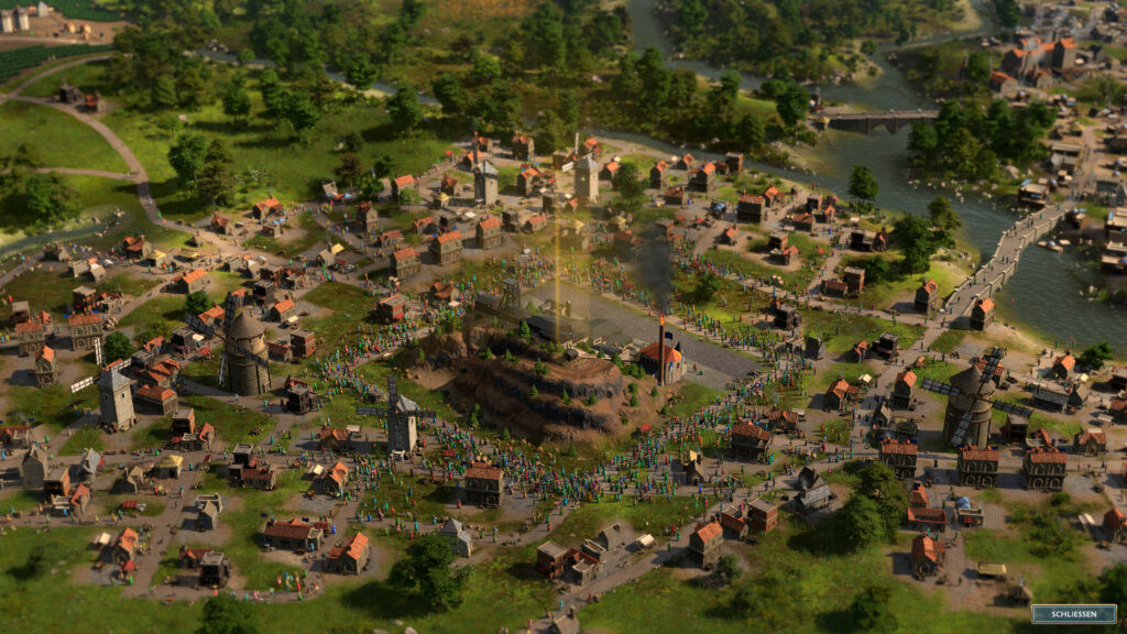 Zugleich lädt das Spiel aber auch zum reinzoomen ein. Das immer größer werdende Netzwerk an Straßen ist reichlich mit Leben gefüllt und passend zur Zeit kommen irgendwann auch Mülltonen, erste Autos und Fahrradständer hinzu. Auch bei den Gebäuden die wir bauen passiert eine Menge. Beim Sägewerk etwa, sind die Arbeiter liebevoll animiert und tragen Holz heran oder schieben Bäume durch die große Säge. Während einer Schlacht sieht man dagegen fliehende Menschen und in unberührten Gegenden lockt das Wildleben. Den etwas übertriebenen Tiefenschärfeeffekt kann zum Glück abschalten.