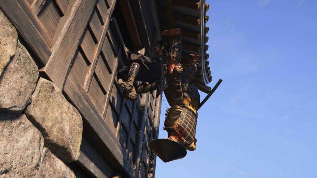 Überhaupt macht es Spaß, die verschiedenen Bewegungssets zu beobachten. Naoe wirbelt im Kampf akrobatisch um ihre Gegner, erklimmt spielerisch Mauern und bewegt sich sicher in schwindelerregenden Höhen. Yasuke wirkt ohne festen Boden deutlich unsicherer und müht sich eher an Hausfassaden hoch, ballt hoch oben angespannt die Fäuste. Auch hat er den wohl einzigartigsten „Leap of Faith“ der Spiele-Reihe – probiert es unbedingt aus! Dafür bewegt er sich deutlich ungestörter durch dichten Schnee.