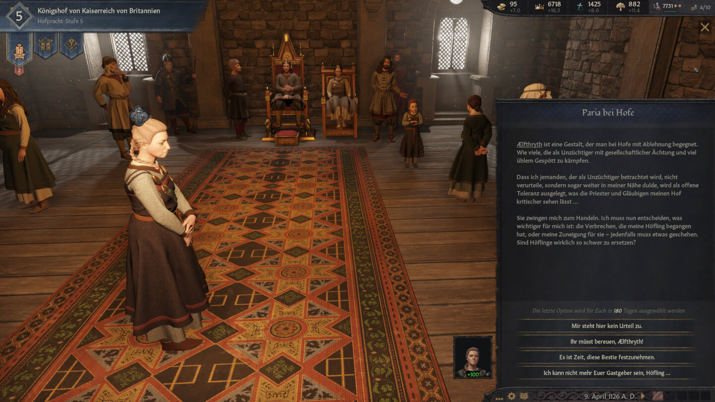 Ganz verlässt der DLC aber nicht die Tradition von Statistiken und Textboxen. Halte ich Hof, kommen drei Bittsteller mit unterschiedlichen Anliegen zu mir. Hier gibt es wie bei anderen Ereignissen die gewohnten Textboxen mit mehreren Auswahlmöglichkeiten. Auch gibt es danach einen Timer, der mir erst nach fünf Jahren wieder erlaubt, Hof zu halten. Das sorgt dafür, dass es sich besser ins bestehende Gameplay einfügt, lässt den Hof aber doch wieder statischer wirken.