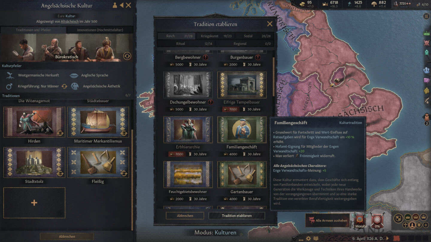Crusader Kings 3: Royal Court lohnt sich daher auch für das neue Kultursystem. Zum einen mag ich den modularen Ansatz an sich, zum anderen fühle ich mich mit der Kultur meines Reiches nun stärker verbunden. Da ich die Kultur selbst mitgestalte, ist sie für mich mehr als nur eine Randnotiz. Als sich das Herzogtum Mercia kulturell abzweigte, tat es mir weh. Auch mag ich nicht so einfach meine Kultur wechseln, wenn ich viel Liebe und Prestige investiert habe. Ich kann sie jetzt ja auch an mein Spiel anpassen. Für meine angelsächsische Kultur habe ich wegen der Insellage eher Traditionen gewählt, die von Hafengebäuden profitieren.