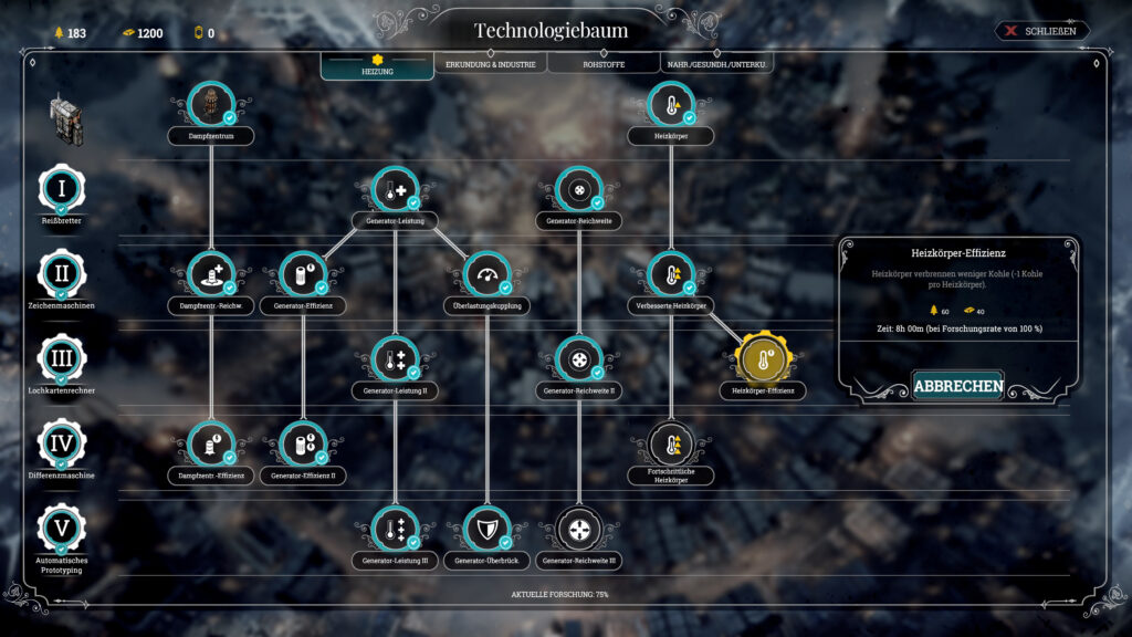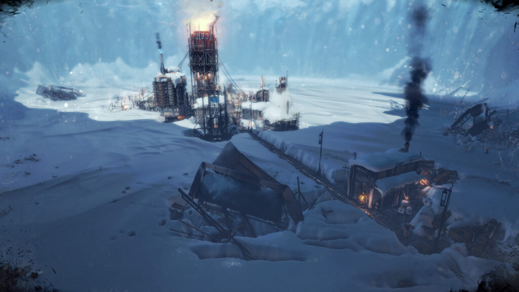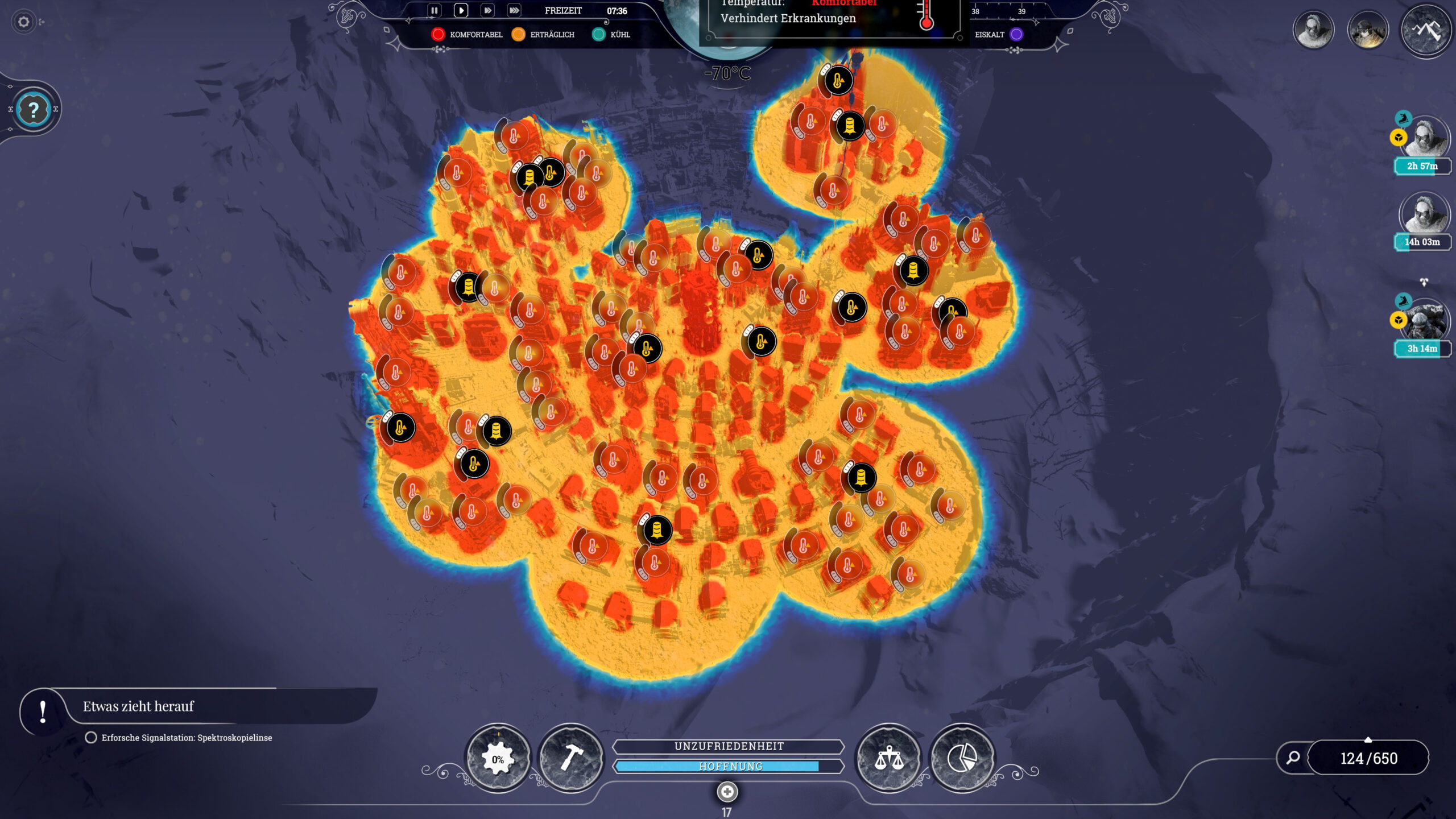 Es gibt feste Zeitpunkte an denen es kurzfristig oder dauerhaft kälter wird. Für den Spieler bedeutet es einen Zwang die Stadt auf die immer garstigeren Bedingungen vorzubereiten. Zelte reichen irgendwann nicht mehr aus und wir müssen den Radius und die Power des Generators ausbauen – oder mit kleineren Generatoren neue Gebiete zum wohnen und arbeiten erschließen. Auch die anfänglich rumliegenden Ressourcen sind schnell erschöpft und wir brauchen neue Wege, um an wertvolle Ressourcen zu gelangen.
