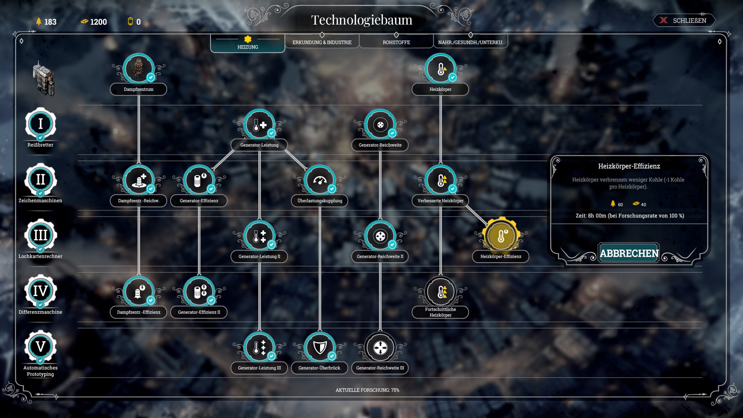 Ganz nebenbei erlasse ich erste Gesetze. Ich verpflichte mich, die Kinder in Kinderheimen unterzubringen. Das steigert die Hoffnung der Bürger – die wohl wichtigste immaterielle Ressource im Spiel. Aber sie müssen auch zusätzlich zur Zeltstadt errichtet werden, die zunächst in nächster Nähe zum Generator entsteht. In der Werkstatt werden dagegen erste Technologien erforscht.