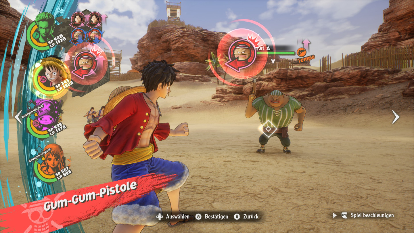 Es ist eher der innere Perfektionist, der das Spiel dann etwas herauszögert, wenn man die Maps nach Würfeln für Fähigkeitsupgrades, Schätzen und Co durchsucht. Vor allem weil wir nur mit einem Crewmitglied als Leader durch die Welt gehen. Und jedes Crewmitglied hat dabei andere Spezialfähigkeiten. Ruffy kommt mit seinen Gummiarmen an entfernte Orte und kann mit seinem Observations-Haki versteckte Gegenstände aufspüren. Nami findet dagegen versteckte Berry und Sanji Zutaten. Und auch wenn man schnell reich ist und nicht zwingend auf Sanjis gesundheitsfördernde Nahrung angewiesen ist, möchte man halt irgendwie nichts auslassen, auch wenn das ständige Wechseln etwas auf die Spiellust geht. Zumindest machen sich Crewmitglieder auch bemerkbar, wenn es was interessantes für sie zu entdecken gibt.