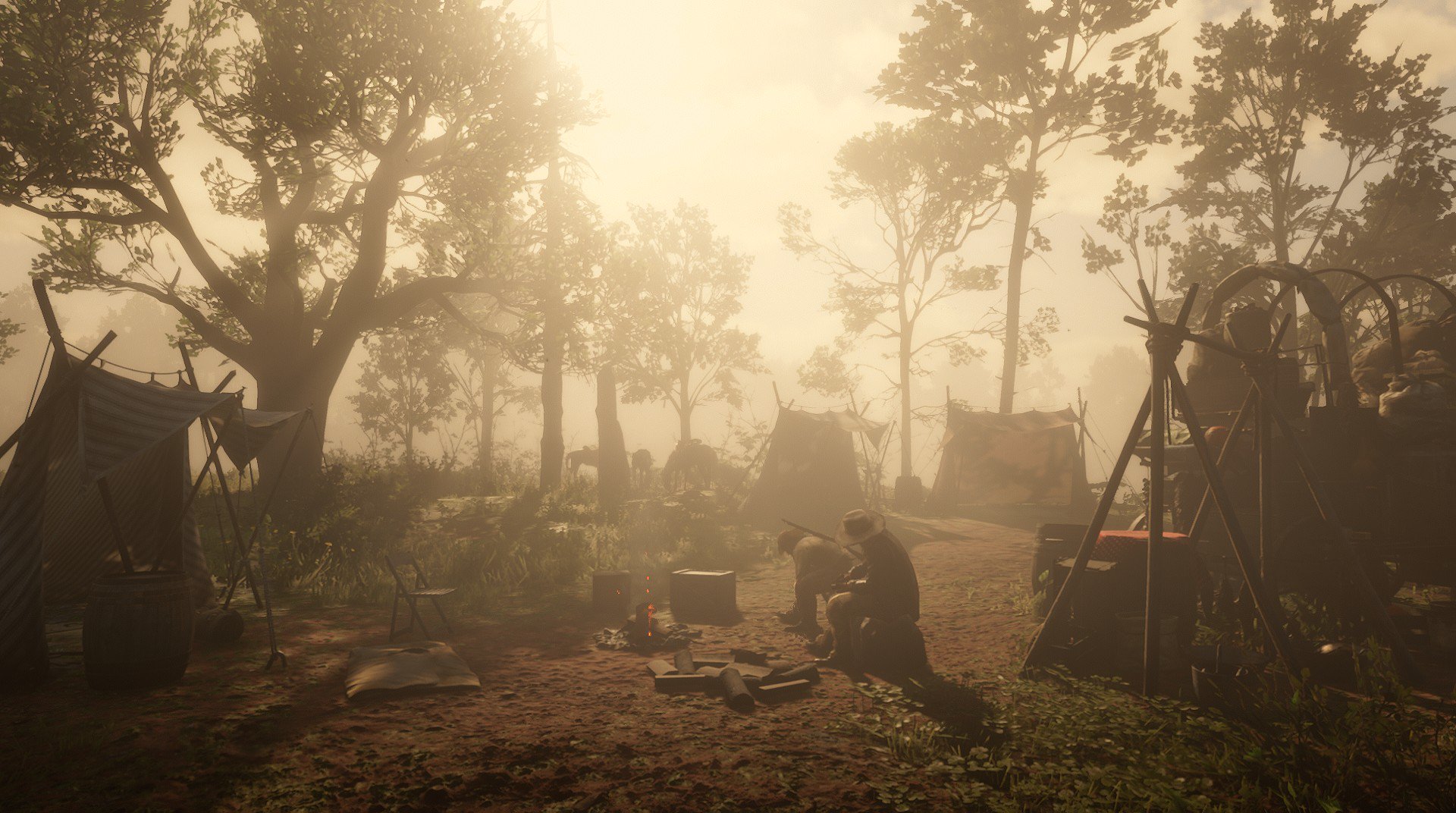 Das Lager der van Der Linde Gang im Wald bei Nebel.