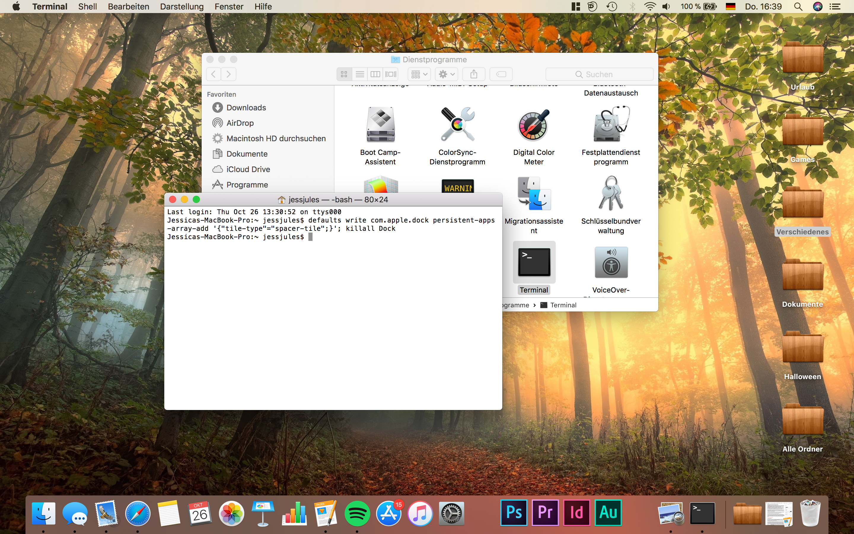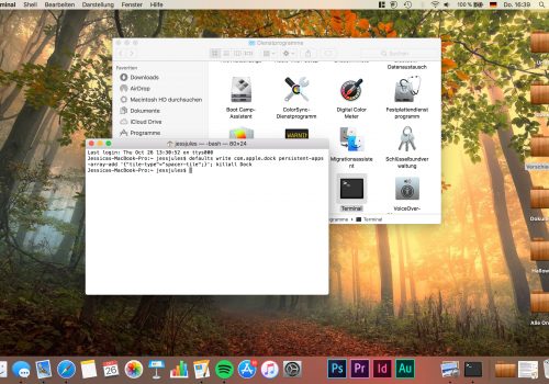Für die Hobbyhacker unter euch (aber auch für absolut unerfahrene Coding-Anfänger wie mich) gibt es zudem die Möglichkeit, Leerstellen in das Dock einzufügen. So könnt ihr beispielsweise Programmgruppen voneinander trennen oder einfach einen neuen Look kreieren. Hierfür müsst ihr das Terminal unter „Dienstprogramme“ öffnen und folgendes eingeben: