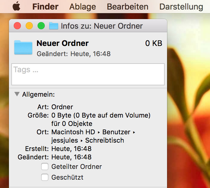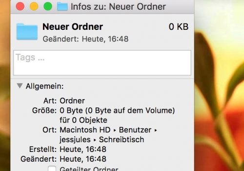 Dafür müsst ihr als Erstes das Informations-Fenster des Ordners aufrufen. Dahin gelangt ihr mit einem Rechtsklick. In diesem Fenster befindet sich links neben dem Namen des Ordners das kleine Icon. Dieses wählt ihr an und kopiert es mit cmd?+c.