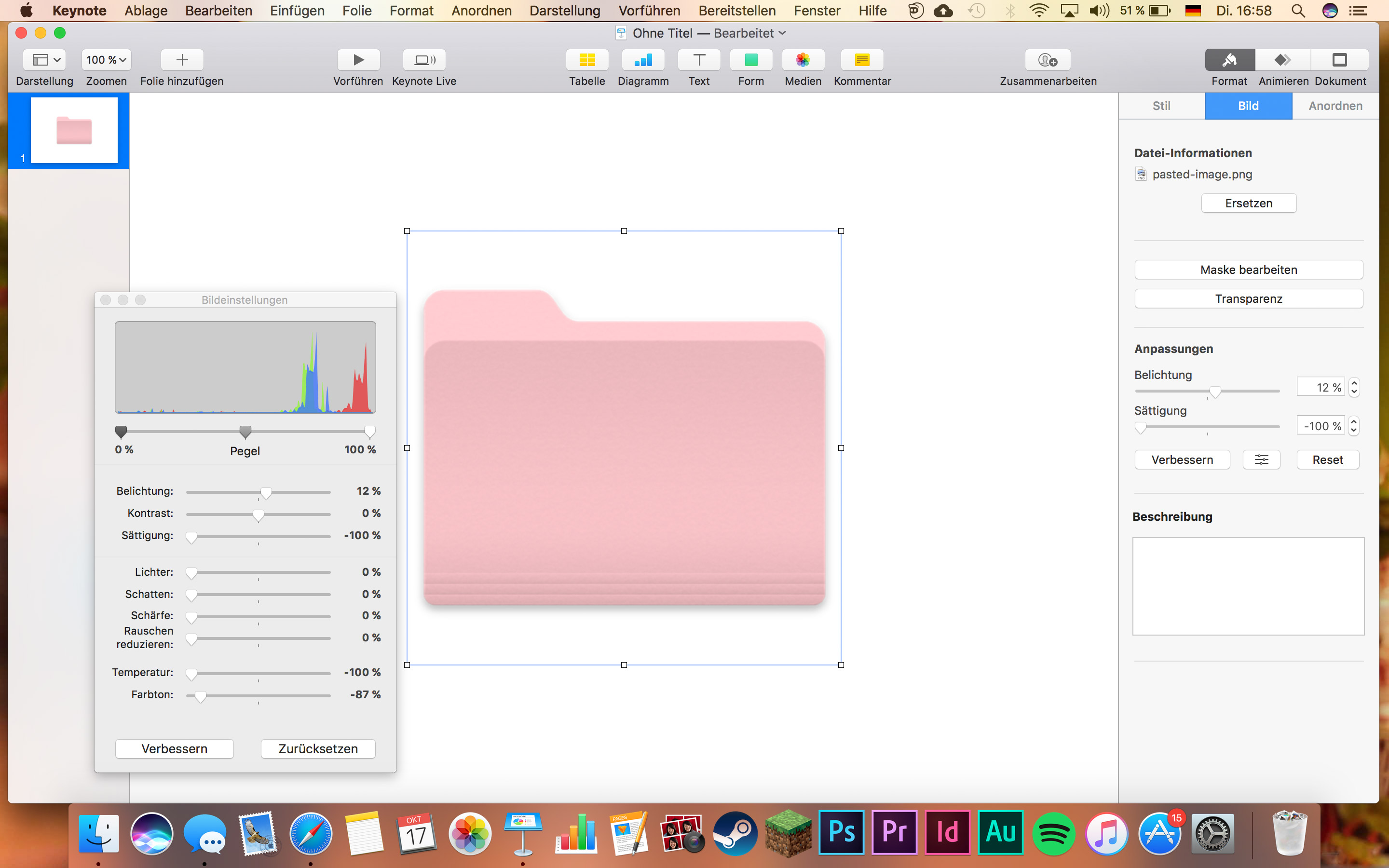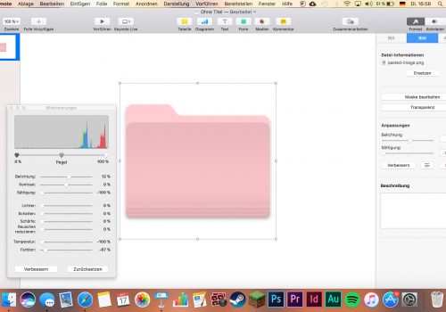 Nun könnt ihr entscheiden, ob ihr Pages oder Keynote öffnet, das macht keinen Unterschied. Ich habe Keynote geöffnet und dann in die leere Folie mit cmd?+v das zuvor kopierte Ordner-Icon eingefügt. Über den Format-Unterpunkt „Bild“ könnt ihr dann ein Bildeinstellungsfenster mit Schiebereglern öffnen. Spielt da etwas an den Reglern und seht zu, wie sich die Farbe eures Icons verändert.