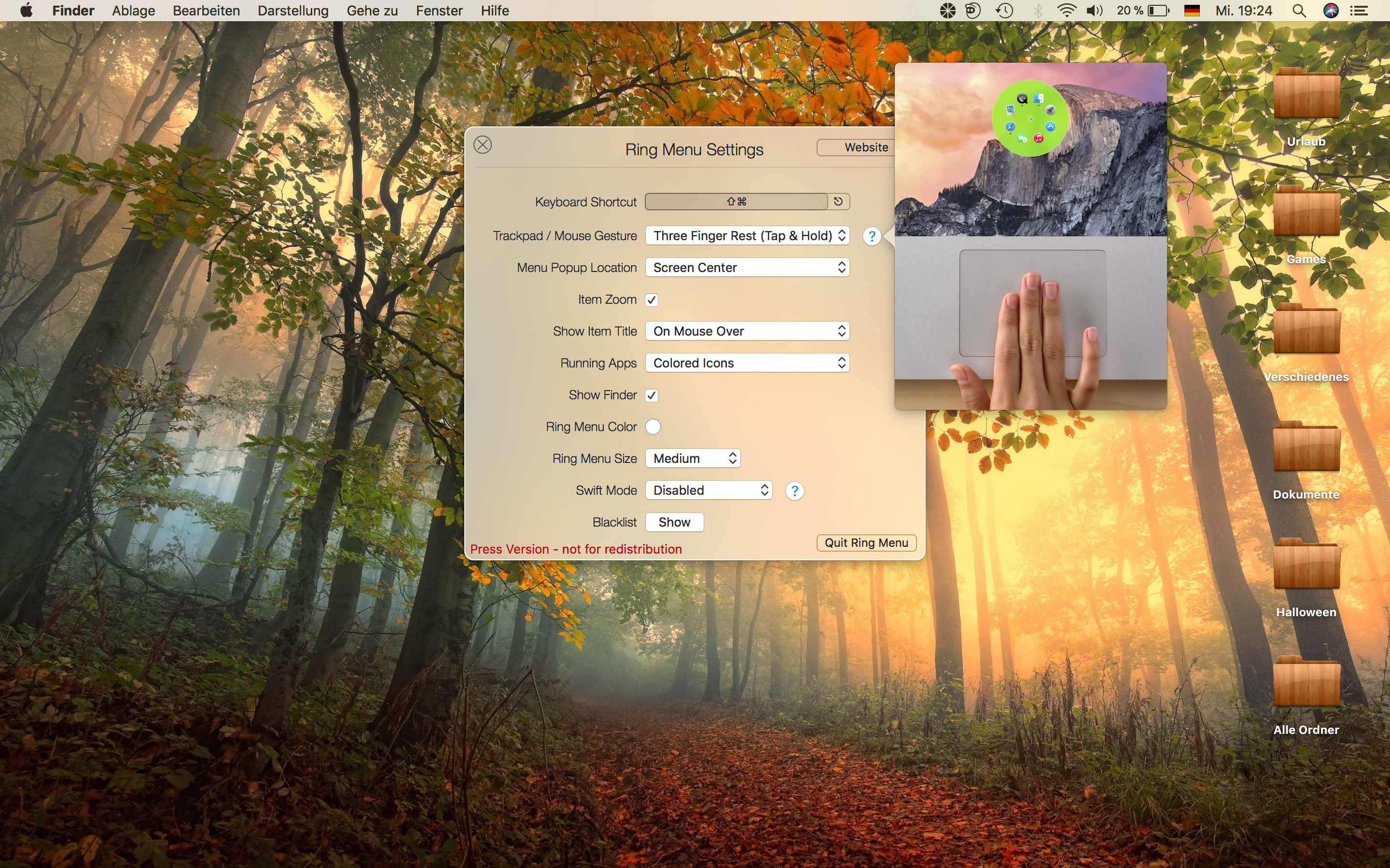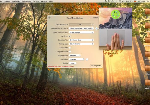 Die Handhabung ist sehr einfach gehalten: Sobald ihr die App öffnet, erscheint das kleine Symbol oben in der Menüleiste. Darüber gelangt ihr zu den Einstellungen. Hier könnt ihr nach euren Bedürfnissen auswählen, mit welcher Trackpad- oder Maus-Geste das Ring Menu geöffnet werden soll. Die Größe und Farbe könnt ihr ebenfalls verändern, wobei es bei den Farben nur sechs Auswahlmöglichkeiten gibt.