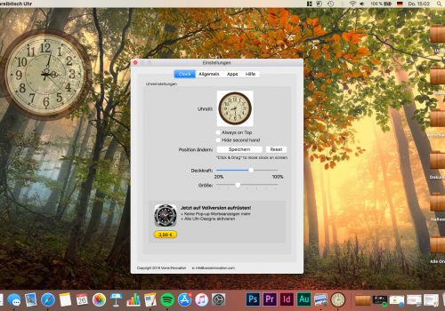 Getestet habe ich für euch die Mechanical Clock 3D Lite und die Schreibtisch-Uhr. Beide stellen analoge Uhren auf dem Desktop dar und bieten so eine gute Möglichkeit, wenn ihr euer macOS anpassen wollt. Die Mechanical Clock 3D Lite ist eigentlich mehr ein animiertes Wallpaper mit Tick-Geräusch. Das Ticken kann man ein- und ausschalten, ich persönlich finde es beruhigend. Einerseits gefällt mir der Look zwar sehr gut. Andererseits ist mir jedoch aufgefallen, dass die Uhr nicht besonders scharf dargestellt wird. Deswegen ist die Mechanical Clock 3D Lite leider nichts für mich. Immerhin ist sie kostenlos erhältlich.