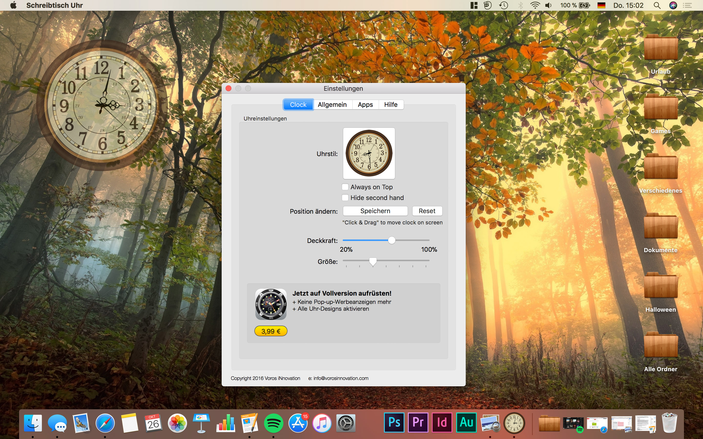 Indem ihr für knapp 4 Euro die Vollversion als In-App-Kauf erwerbt, könnt ihr auch die kostenpflichtigen Designs auswählen und unter macOS anpassen. Letztendlich finde ich aber, dass die kostenlosen Designs eine gute Auswahl darstellen. Kurzum lohnt sich der Besuch im Mac App Store, wenn ihr die Uhr unter macOS anpassen möchtet.