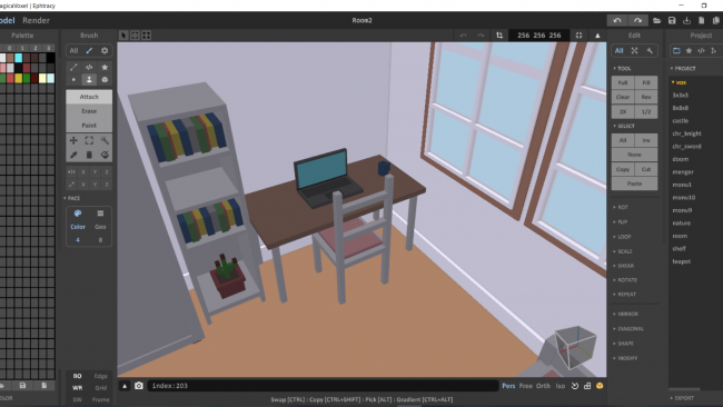 Neben der Farbpalette habt ihr dann eine kleine Auswahl an Tools. Zum Beispiel ein Shape-Tool, mit dem ihr ein paar bestimmte Formen erzeugen könnt, einen Stift, der einzelne Voxel platziert und ein Extrude-Tool, mit dem ihr Oberflächen hinzufügen oder vermindern könnt. Für jedes dieser Tools gibt es die Möglichkeit “Attach”, “Erase”, oder “Paint” zu wählen. Mit Attach fügt ihr neue Voxel hinzu, mit Erase nehmt ihr Voxel weg und mit Paint könnt ihr Oberflächen in einer anderen Farbe anmalen.