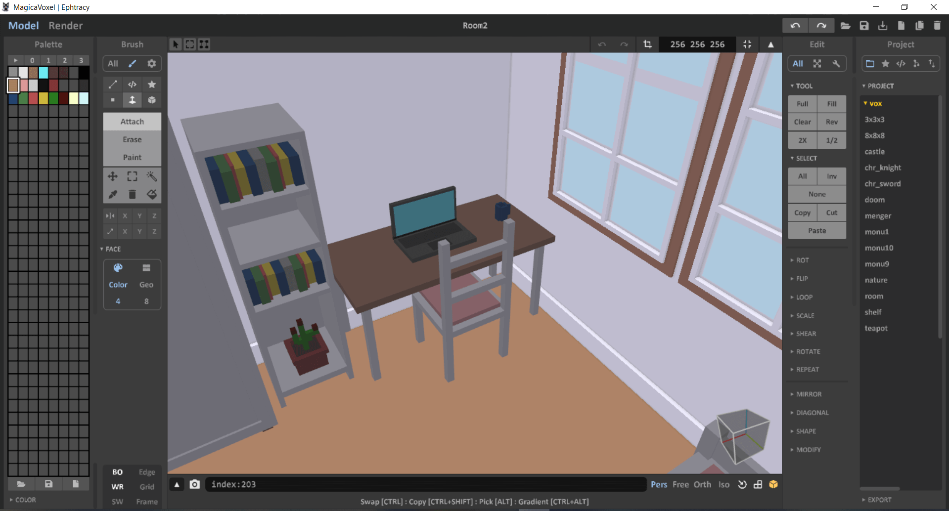 Was mir an MagicaVoxel so gefällt, ist der schnelle Einstieg. Jeder der schonmal Minecraft gespielt hat, wird relativ gut damit zurecht kommen, Blöcke in einen Raum zu platzieren. Die Software teilt sich grob in zwei Ansichten. Die Model-Ansicht und die Render-Ansicht.