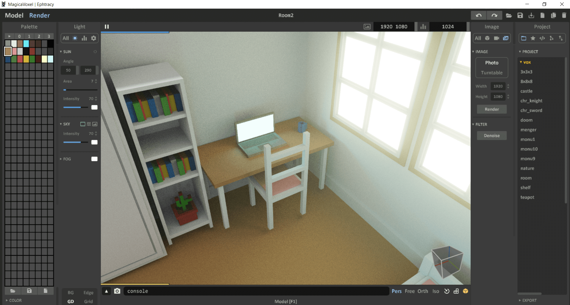 Neben der Model-Ansicht gibt es die Render-Ansicht. Hier könnt ihr euch das Rendering eures 3D-Modells anschauen. „Rendern“ bedeutet so viel wie “ein Bild zu erzeugen” und ein Renderer ist eine Art Programm, die genau das macht. Der Renderer nimmt Informationen, wie die Positionen eurer Voxels sowie deren Oberflächen und Eigenschaften und erzeugt daraus ein Bild. Im Grunde also das, was auch ein Maler macht, wenn er ein Bild malt. Er nimmt bestimmte Informationen auf und erzeugt daraus mit den ihm zur Verfügung stehenden Mitteln ein Bild. Der Renderer verwendet nur eben keine Farbe und Pinsel sondern Pixel.