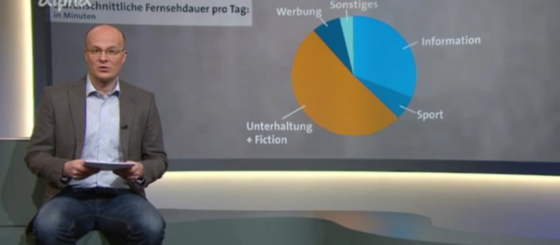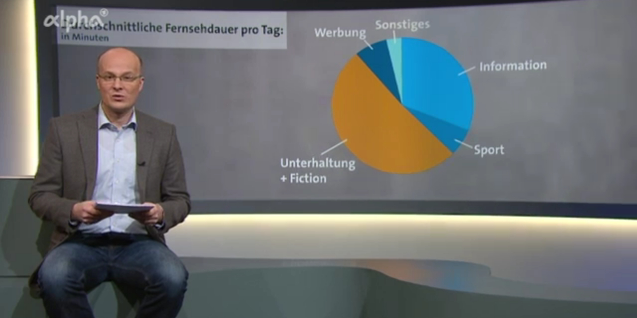 Nach dem Einspieler wird eine Grafik präsentiert, welche zeigt, dass die Unterhaltung zusammen mit Serien und Spielfilmen den größten Teil des konsumierten Fernsehens ausmacht. Bei einer durchschnittlichen Fernsehdauer von vier Stunden am Tag werden zwei davon von Unterhaltungssendungen eingenommen.