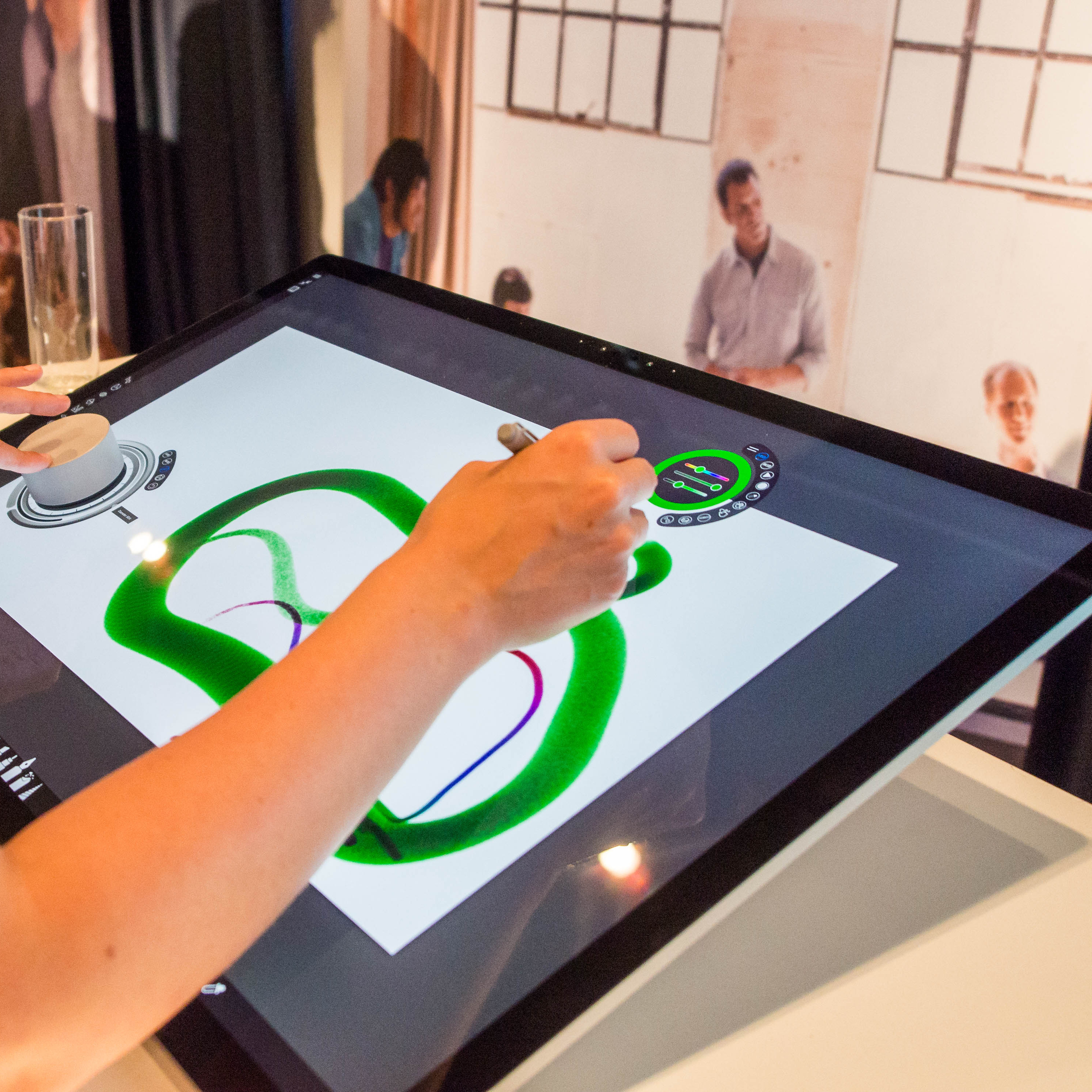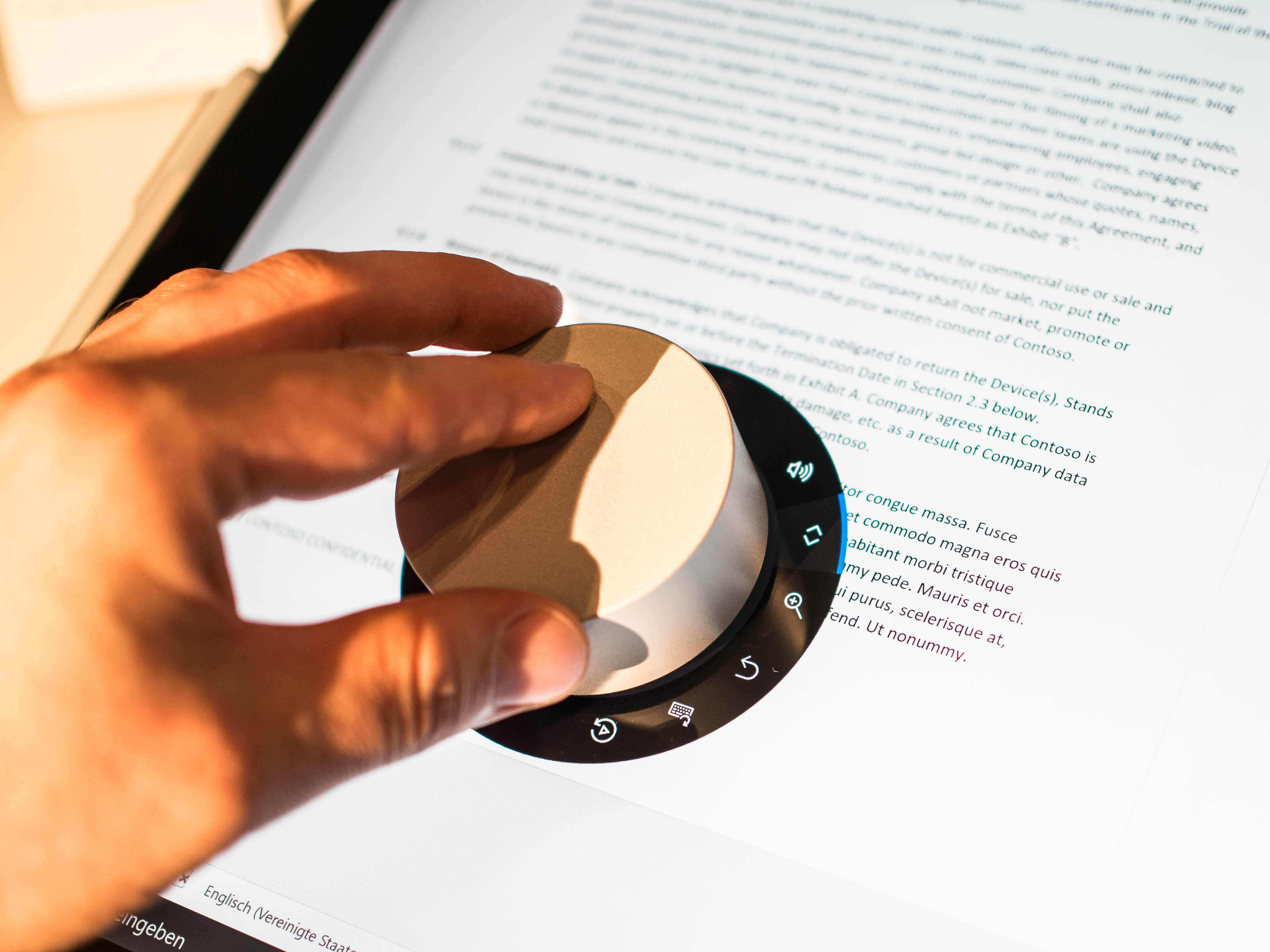 Den größten Wow-Effekt aller Eingabemethoden vermittelt das Kontrollrad, das den Namen Surface Dial trägt. Ich kann es wahlweise auf oder neben dem Display platzieren. Liegt es auf dem Bildschirm, schmiegt sich das eingeblendete Schnellmenü kreisrund um das Puck-Gehäuse. Je nachdem, mit welcher Hand ich das Dial bedienen möchte, kann ich die Bediensymbole rechts oder links vom Dial-Gehäuse einblenden lassen.