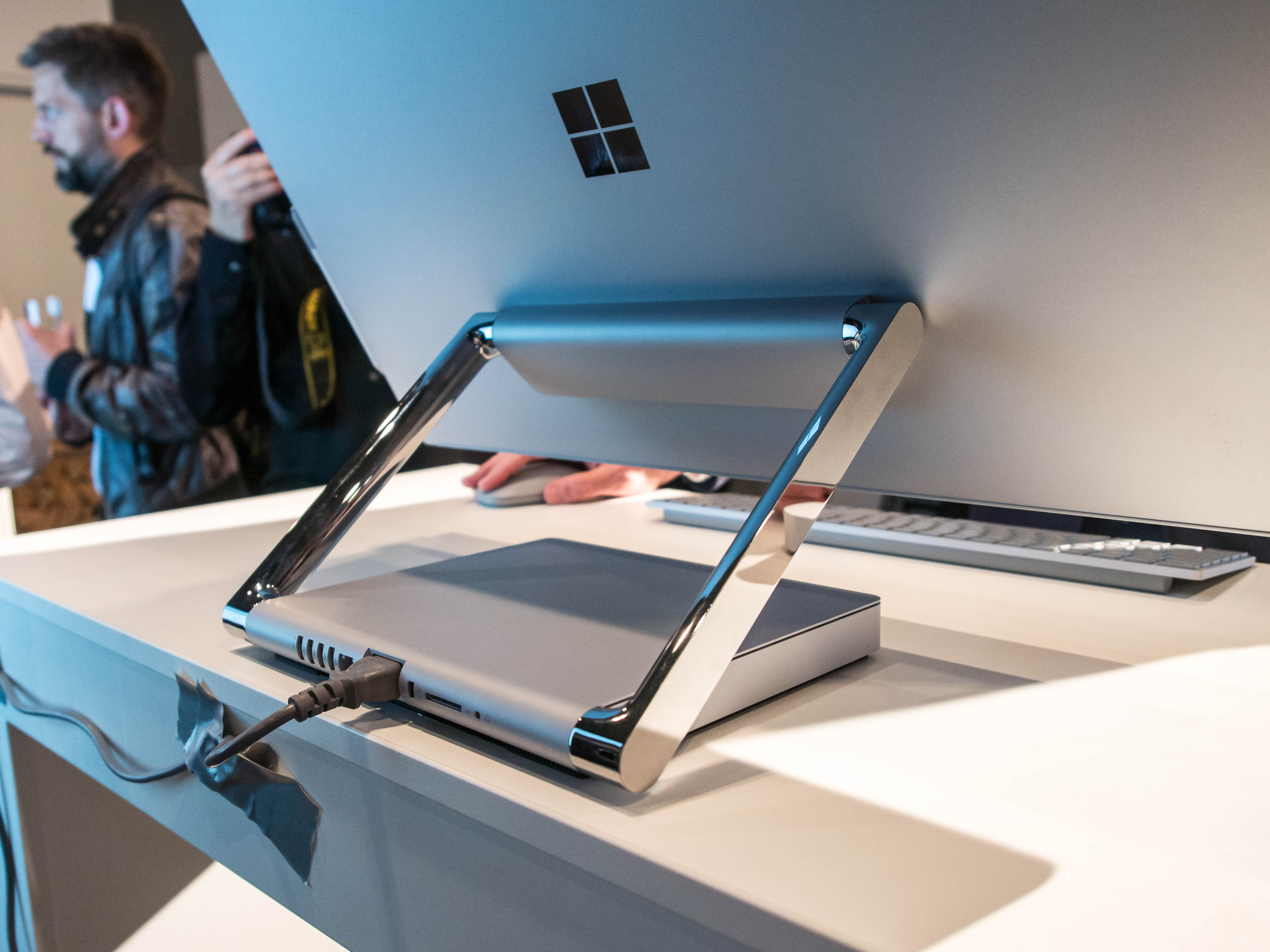 Der Surface Studio besteht aus einem 28-Zoll-Display, eingefasst in einen Metall-Korpus, der an zwei Scharnieren mit dem Sockel verbunden ist. Anders als beim iMac führt das Stromkabel des Surface Studio nicht zur Display-Rückseite, sondern mündet in den Standfuß. Dadurch wirkt das Ensemble noch etwas aufgeräumter.