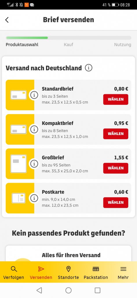 Für euren Code geht ihr in der App unten auf „Versenden“. Dort könnt ihr Auswählen, ob ihr ein Paket oder einen Brief versenden wollt. Je nach Auswahl stehen euch mehrere Produkte zur Verfügung. Seid ihr euch noch unschlüssig, als was euer Brief oder Paket zählt, hilft euch unter der Brief- oder Paketauswahl der Portoberater weiter.