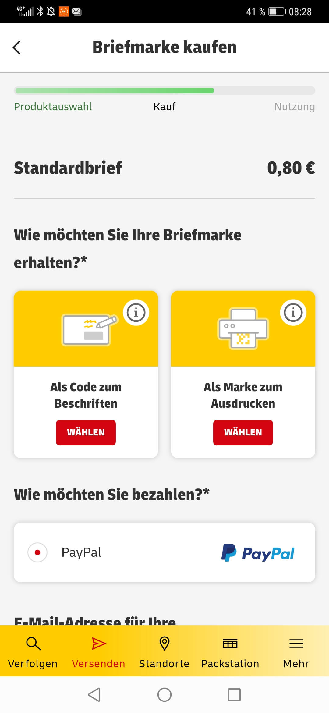 Habt ihr eure Mobile Briefmarke ausgewählt, könnt ihr euch entscheiden, ob ihr die Marke als PDF zum Ausdrucken und Aufkleben oder nur als Code zum selbst Draufschreiben wollt. Der Code zum Beschriften sollte jedoch schneller gehen und ist umweltfreundlicher.