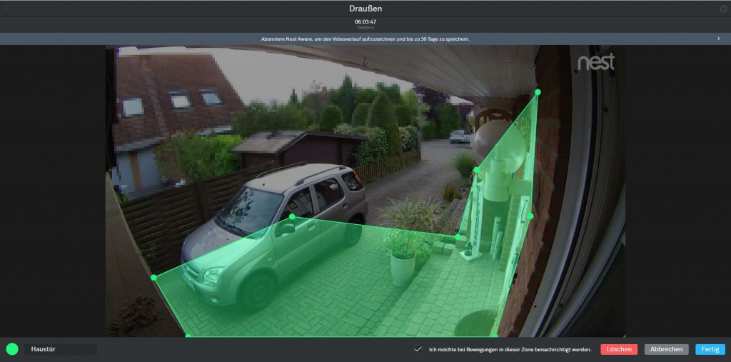 Die letzte, sehr nützliche Funktion von Nest Aware ist das Einrichten von Warnbereichen. Die Bedienmaske, die leider nur in der Webansicht am Computer zugänglich ist, ermöglicht es dem Nutzer, über eine Drag-and-Drop-Maske gesonderte Warnmeldungen zu erhalten. In diesem Fall haben wir den Haustürbereich festgelegt, um zu testen, ob vorbeifahrende Autos von der Kamera ignoriert werden.