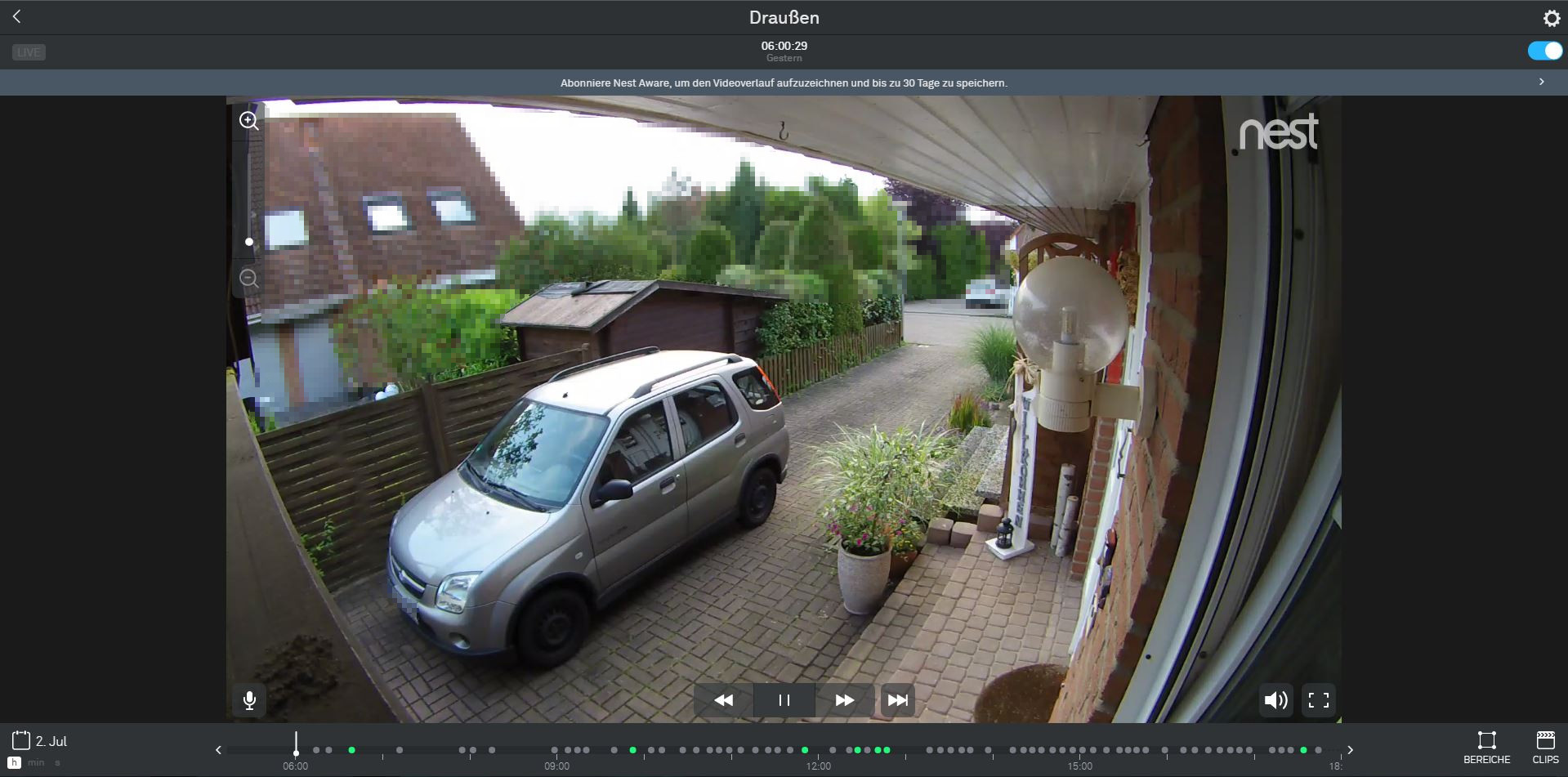Die Kamera verfügt außerdem über die Nest Aware-Ansicht. Hier ist jeder Punkt in der Zeitleiste ein von der Kamera wahrgenommenes Ereignis. Die Zeitleiste von Nest Aware kann die Meldungen der Warnzonen farblich zugehörig sortieren. Je nach Ausrichtung der Kameras können so eine große Anzahl an Meldungen zusammenkommen. Insgesamt wurden mir an einem Wochenende 228 Warnmeldungen angezeigt, von denen 24 in jedem Fall angemessen, aber der Großteil vorbeifahrende Autos, Schatten oder sogar nur ein paar Fliegen waren. Angemessen bedeutet in diesem Fall: Die Nachbarskatze lief über unsere Treppe, Besuch stand vor der Haustür oder wir sind selbst aus dem Haus gegangen, um etwas zu holen.