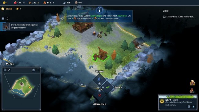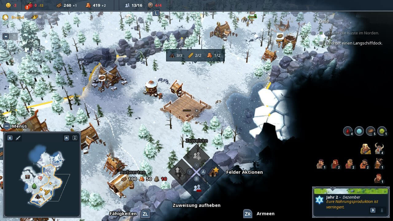Eine Spielmechanik, die Northgard auf Konsolen wie auf dem PC besonders macht, ist der Wechsel der Jahreszeiten. So sehen wir ständig, in welchem Monat wir uns gerade befinden und sollten zusehen, dass wir uns in den wärmeren Monaten für den Winter rüsten. Denn der hat es in sich: die Produktionen verlangsamen sich, es wird Holz zum Heizen benötigt und mehr als einmal ist mir während meines Tests die Nahrung ausgegangen. Verhungerte Bürger sind im Übrigen nicht so produktiv – habe ich dann festgestellt ;) Leider sind die Winter in Northgrad tatsächlich manchmal etwas langweilig. Insofern wir nicht gerade militärisch aktiv sind, bleibt uns wenig anderes übrig, als abzuwarten, dass der Winter zu Ende geht.
