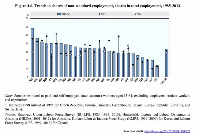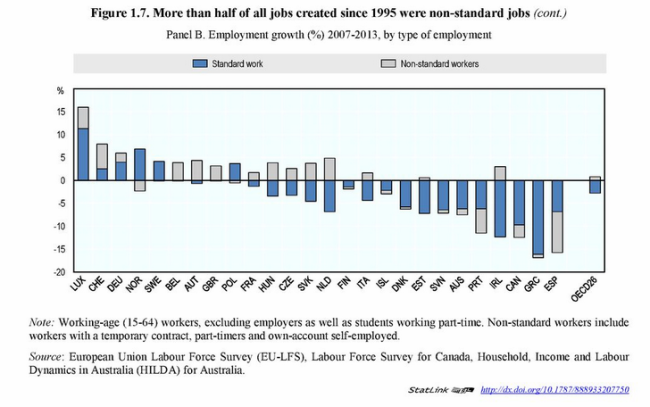 Wie das kam, lässt sich an den Zahlen seit den 1990er Jahren ablesen. Nahezu 60 Prozent des gesamten Beschäftigungswachstums in der OECD erfolgte seitdem v.a. in Form von Nicht-Standardarbeit.