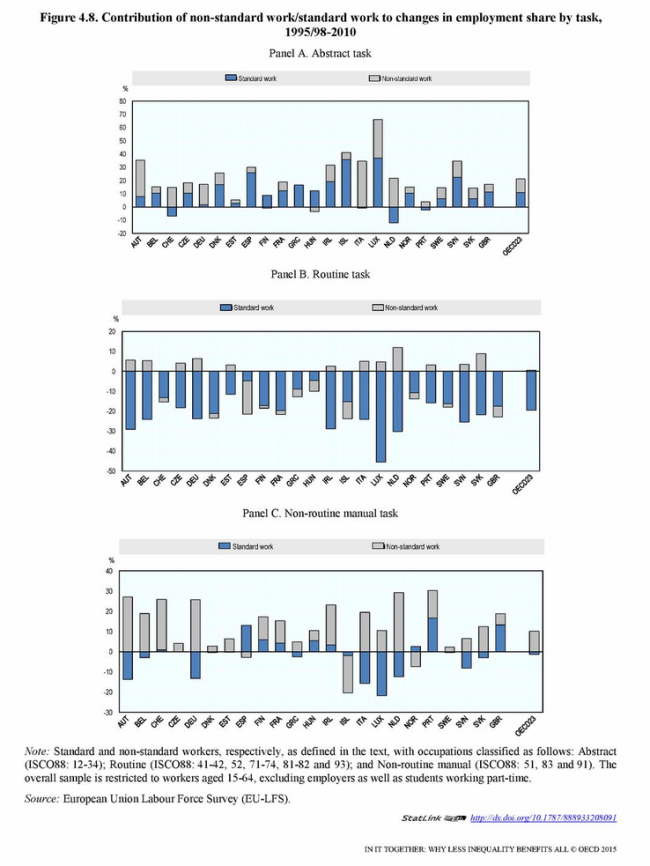 Da fast alle Arbeitsplatzverluste, unabhängig von der Art der Aufgabe, im Bereich der Standard-Arbeit zu verzeichnen sind, während sich das Beschäftigungswachstum hauptsächlich in Form von atypischer Beschäftigung vollzog, kann nach Ansicht der OECD der technologische Fortschritt allein nicht als einzige Erklärung für die Job-Polarisierung dienen. Arbeitsmarktinstitutionen und die Politik haben wahrscheinlich eine wesentliche Rolle gespielt, wie sich bestimmte Muster des Jobaustausches in bestimmten Ländern vollzogen.