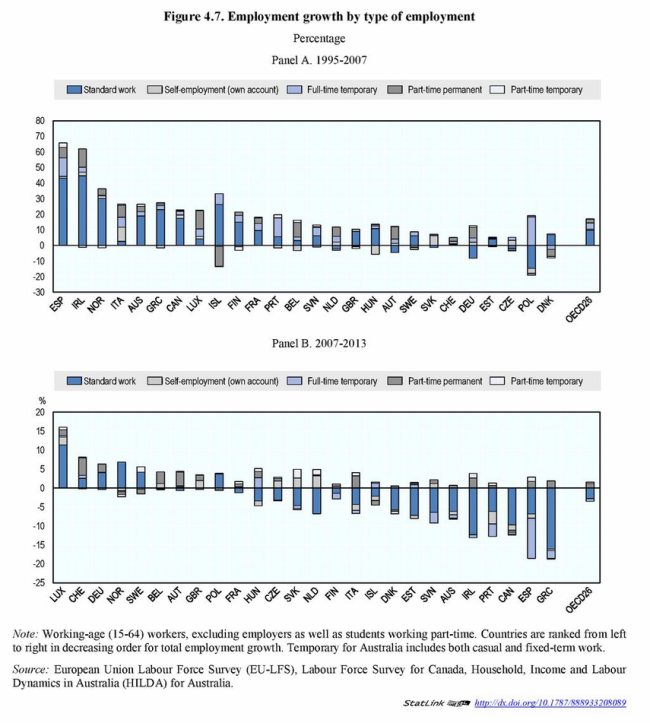 Vor allem setzten diese Bereiche auf temporärer Beschäftigung auf. Sie ist in mehr als drei Viertel aller OECD-Länder gestiegen und ist für das Gros des Anwachsens der Nicht-Standardarbeit verantwortlich. Hinzu kommt ein bedeutender Anstieg der permanenten Teilzeit-Beschäftigung.