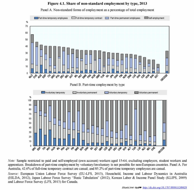 Man muss sich nicht einsam fühlen. In den OECD-Staaten verteilt sich ein Drittel der gesamten Beschäftigung auf Nicht-Standardarbeit, die sich eben aus temporärer bzw. befristeter Arbeit, Teilzeitarbeit und Selbstständigen zusammen setzt.