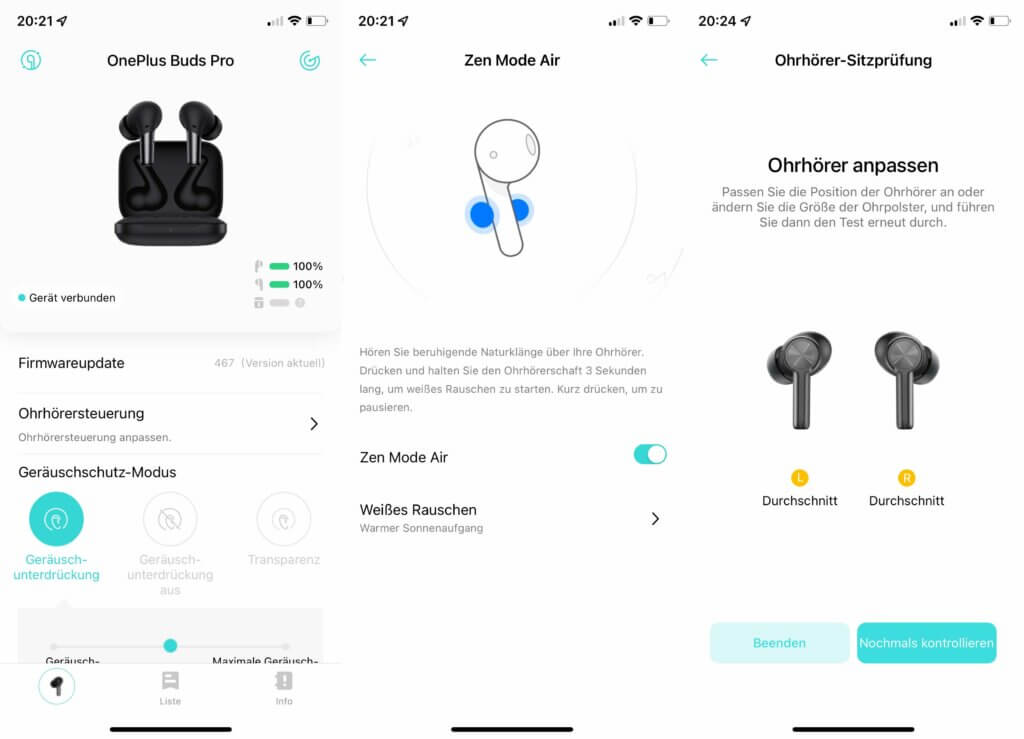 Für die beste Funktionalität spendiert OnePlus die App „Hey Melody“. Sie befindet sich sowohl im Android Play Store als auch im Apple App Store. Die herstellereigenen Smartphones liefern die Optionen direkt in der Nutzeroberfläche mit. Neben dem ANC-Modus lassen sich hier Shortcuts zur Kopfhörer-Steuerung nach Belieben definieren. Außerdem hilft die Sitzprüfung beim Finden der passenden Earbuds und somit der perfekten Position. Ferner ermöglicht die App das unkomplizierte Aktualisieren der Firmware. Hier nehmen sich die Konkurrenzprodukte nichts.