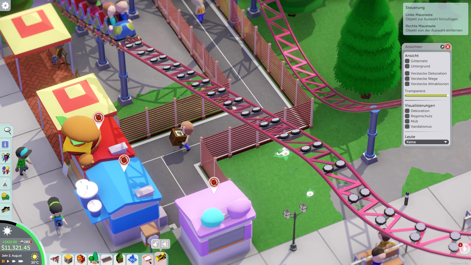Allerdings liegt das auch nicht unwesentlich an den Standard-Preisen für die Fahrgeschäfte. Auf fast jedes Fahrgeschäft könnt ihr problemlos noch einen bis drei Dollar Eintrittsgeld obendrauf packen, bevor die Gäste sich beschweren. Ein ähnliches Bild bei euren Verkaufsbuden: Im Normalfall könnt ihr dort knapp die Hälfte des Ursprungspreises draufschlagen, ohne dass es sich negativ in den Verkaufszahlen niederschlägt. Hat man sich erst einmal in die Preisgestaltung eingefunden, ist es auch bei Parkitect nicht schwer, einen ertragreichen Park zu führen.