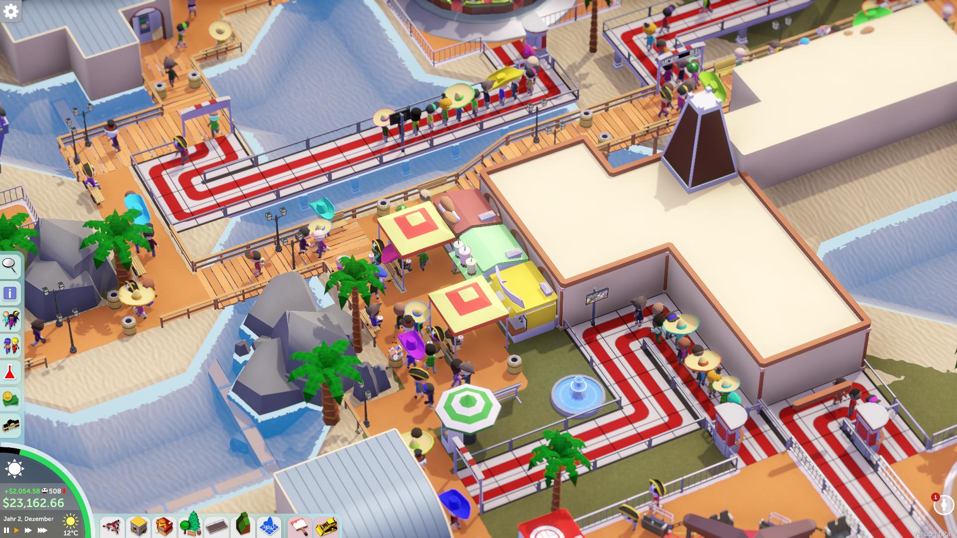 Darum könnt ihr Mitarbeiterwege verlegen, über die eure Träger die Waren zum Hintereingang liefern. Diese Wege solltet ihr aber entsprechend durch Dekorationen, Hügel oder zumindest einen hohen Zaun verbergen. Mit Depots und einem unterirdischen Warensystem, könnt ihr die Waren deutlich näher an die Verkaufsbuden bringen und erspart euren Mitarbeitern den langen Weg zum Hauptlager. Da die Arbeit im Park anstrengend sein kann.
