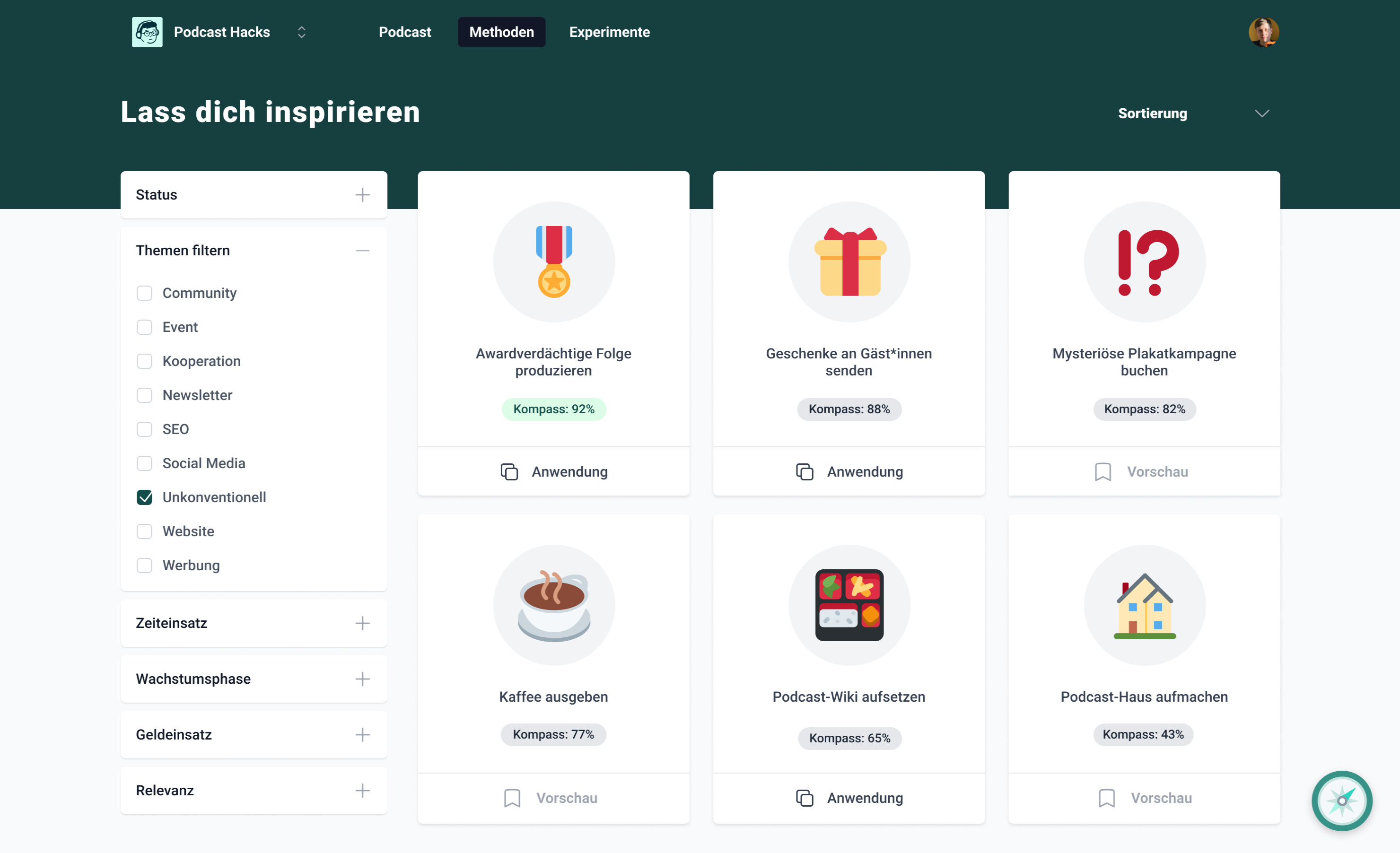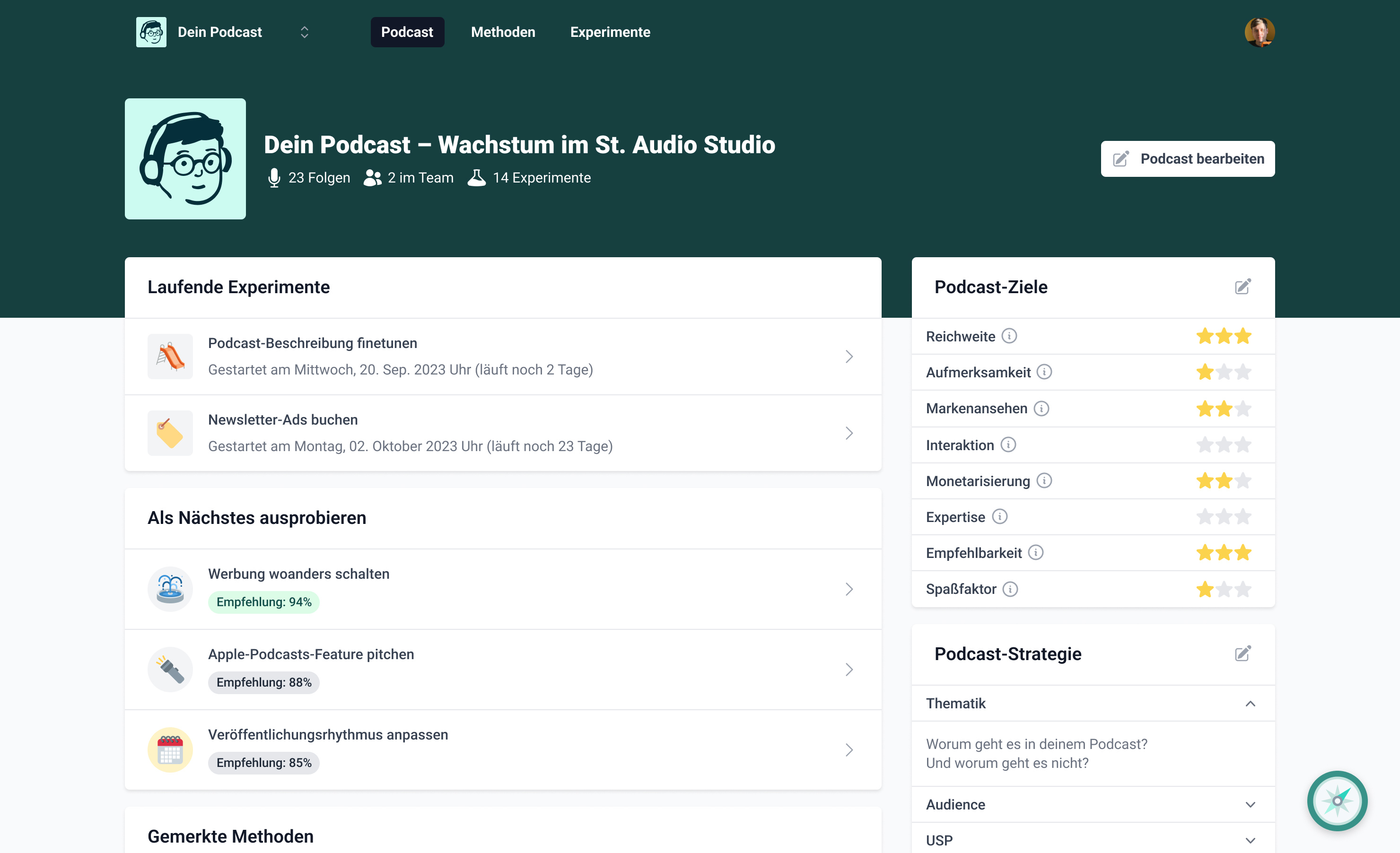 Die meisten Podcaster*innen verbringen in der Regel doppelt so viel Zeit mit ihren Inhalten, wie sie aufbringen, um diese nach der Veröffentlichung zu bewerben. Ich möchte das Verhältnis von Produktion zu Distribution eher einander angleichen. Im St. Audio Studio finden die Audioschaffenden dafür Inspiration und Anleitung. Ganz konkret analysiert unser Tool, mit welchem Marketing-Mix Podcasts wachsen. Und gibt diese Tipps entsprechend weiter. Dann heißt es: „Das solltest du als Nächstes ausprobieren“. Die wichtigste Erkenntnis für mich ganz persönlich war, dass wir alle Reichweite immer entsprechend unserer eigenen Wachstumsphase und Ressourcen aufbauen. Das befreit auch! Denn plötzlich realisiert man, dass man sich nicht mit den Formaten ganz oben Charts oder solchen vergleichen muss, die schon zehn Jahre dabei sind. Im Studio kann man nun entweder dem empfohlenen Pfad folgen oder sich frei durch alle +150 Methoden und Kategorien filtern. Letzteres übrigens komplett kostenlos.