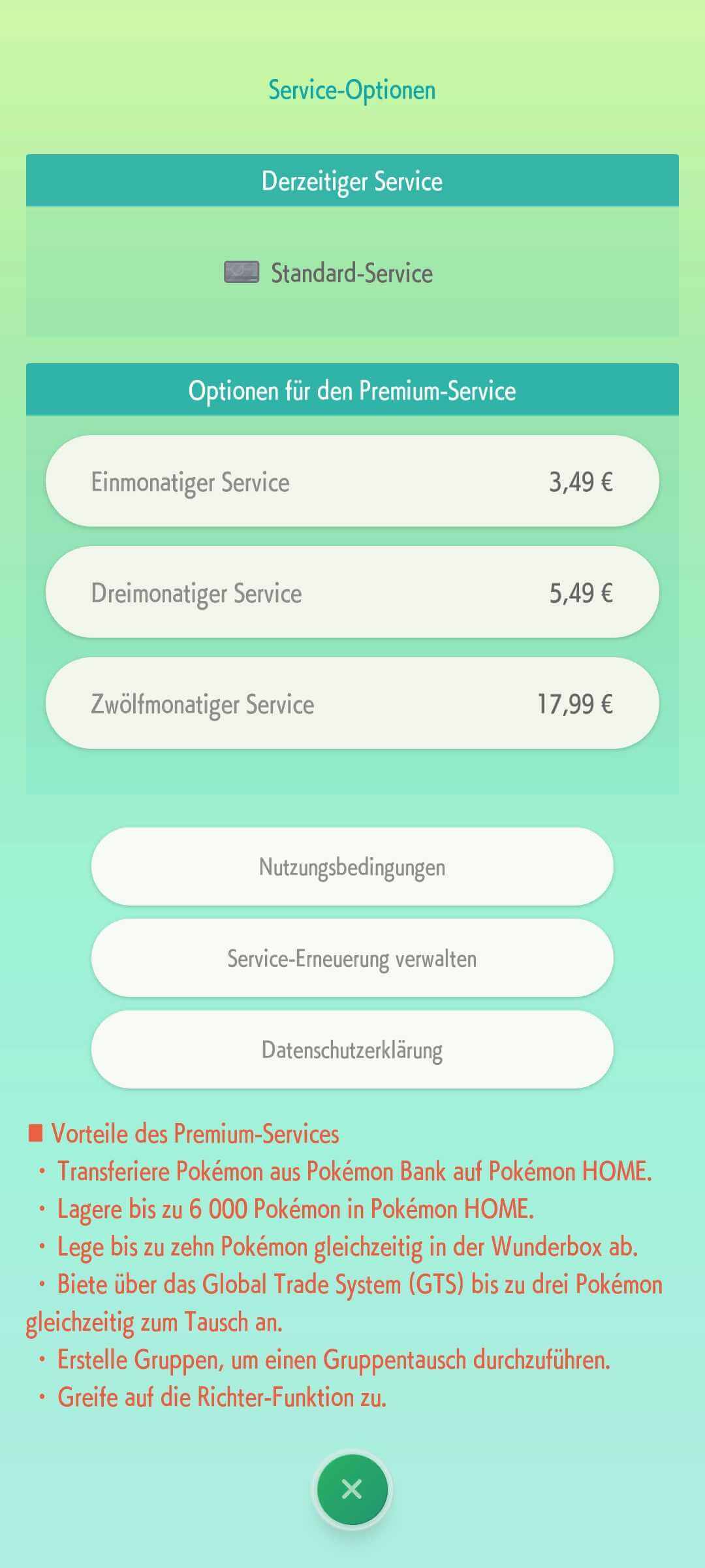 Pokémon Home ist in der Standard-Version kostenlos. Diese ermöglicht es euch, 30 Pokémon zu lagern, drei in die Wunderbox zu legen und ein Pokémon gleichzeitig in die GTS abzulegen. Für Geld könnt ihr ein Premium-Abo abschließen. 30 Tage kosten 2,99 Euro. Für 4,99 Euro erhaltet ihr 90 Tage Premium und für 15,99 Euro 365 Tage. Mit Premium könnt ihr den Pokémon Bank Transfer verwenden, 6.000 Pokémon lagern, 10 in der Wunderbox ablegen, 3 gleichzeitig im GTS und einen Gruppentausch erstellen. Außerdem steht euch die Richter-Funktion zur Verfügung. Ob das den nicht gerade geringen Preis rechtfertigt, muss jeder selbst entscheiden. Wenn ihr aber euer Abo beendet, ohne eure Pokémon vorher wieder in das Spiel zu übertragen, kommt ihr bis zum Abschluss eines neuen Abos erst einmal nicht mehr an sie heran. Es ist ein bisschen so, als würde die Pokémon Company eure Taschenmonster als Geiseln nehmen.