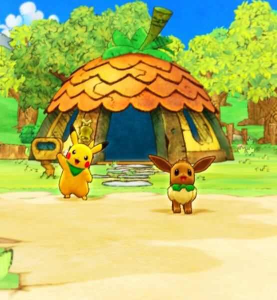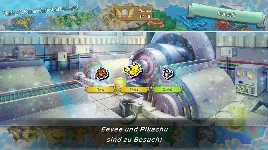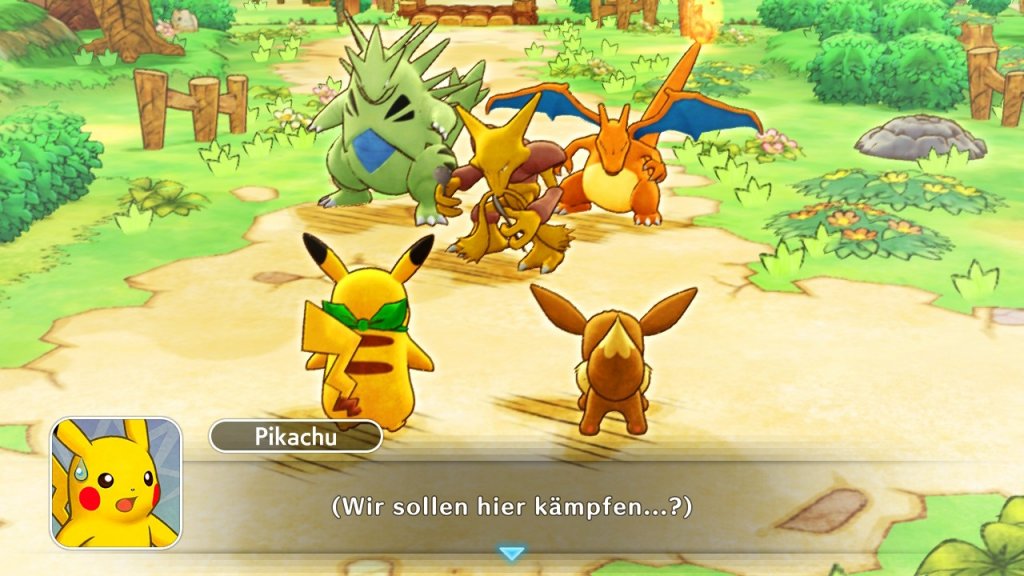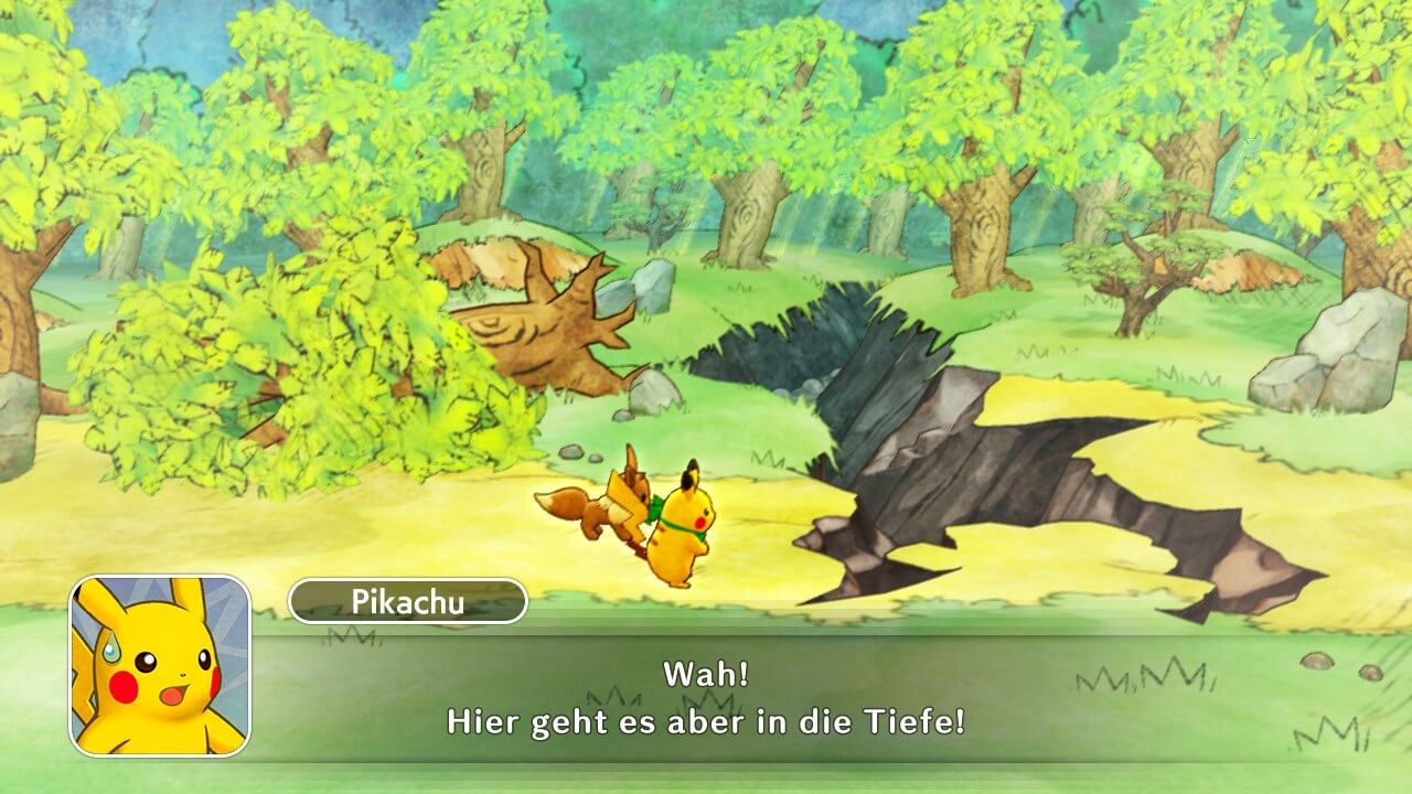 Nach diesem Einstieg werden wir direkt in die Welt der Pokémon geworfen. Dies ist in diesem Spiel ganz wörtlich zu nehmen. Unser Protagonist ist nämlich ein Mensch, der in ein Pokémon verwandelt wurde. Die Welt, in die er transportiert wurde, wird von sprechenden Pokémon bevölkert. Hier trifft er auf seinen zukünftigen Partner, der das große Verlangen hat, allen Pokémon zu helfen. In dieser Welt gibt es sogenannte Retterteams, die Pokémon aus dunklen Höhlen oder Wäldern retten oder Schätze aufspüren. Zu Beginn retten wir mit unserem neuen Partner ein kleines Raupy aus einem Dungeon. Nach diesem ersten Abenteuer gründen wir unser eigenes Retterteam. Meines heißt passenderweise Team Let’s Go.