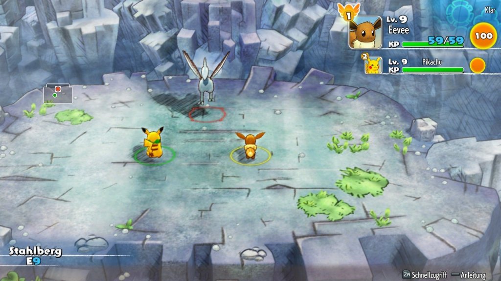 Pokémon-Typisch verfügen unsere Protagonisten über vier Attacken. Diese sind aufgrund des etwas anderen Spielaufbaus komplett anders zu nutzen. Schließich bewegen wir uns mit unserm Team über eine Art Raster. Gegner nähern sich uns mit jeder Aktion an, wir können aber auch vor ihnen weglaufen. Die Attacke Ruckzuckhieb zum Beispiel lässt sich über zwei Felder nach vorne ausführen, Spuckball oder Flammenwurf sogar durch den ganzen Raum. So können wir unserem Gegner schaden, bevor er uns überhaupt erreicht hat. Auch unser Team-Partner, der meist hinter uns herläuft, kann so über uns hinweg den Gegner attackieren. Für die optimale Schadensausbeute ist eine gute Positionierung der Schlüssel zum Erfolg.