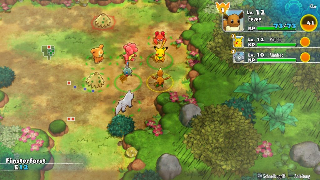 Hier hat sich im Vergleich zum Original in jedem Fall die KI der Mitstreiter verbessert. Mein Partner-Pokémon Pikachu bewegt sich um einiges sicherer und überlegter durch die dunklen Dungeons. Er läuft in Position, nutzt Fernangriffe und kann uns im Notfall auch eine heilende Sinelbeere reinschieben. Das war früher noch etwas anders. In Retterteam Rot und Blau schossen unsere Partner gerne einmal einen Flammenwurf ins Leere und spamten neu erlernte Status-Moves. Das führte soweit, dass es sogar eine Möglichkeit gab, bestimmten Attacken komplett auszuschalten.