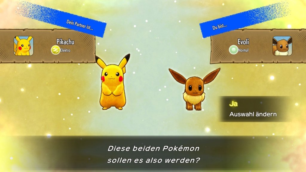 Bereits zu Beginn des Spiels überfällt mich ein Schwall an Nostalgie. Nach dem Intro, das ich mir damals bereits hunderte Male angesehen habe, starten wir mit einem kurzen Persönlichkeitstest ins Abenteuer. Hier beantworten wir Fragen wie „Vor dir liegt eine Schatzkiste. Was tust du?” oder „Du hörst Schreie aus einem Zimmer vor dir. Was tust du?”. Je nach Antwort und Geschlecht wird uns eine Persönlichkeit und so auch unser Pokémon zugeordnet. Da ich als „Naiv” eingestuft wurde, durfte ich mich über Evoli als Hauptcharakter freuen. Alle, denen dieser Test zu doof ist, dürfen, anders als im Original, sich im Anschluss aber auch für eines der anderen Pokémon entscheiden. Nach unserem Protagonisten wählen wir noch unseren Partner. Hier habe ich mich für das Maskottchen Pikachu entschieden, da ich die Kombination der beiden Pokémon aus den Let’s Go-Spielen sehr passend fand.