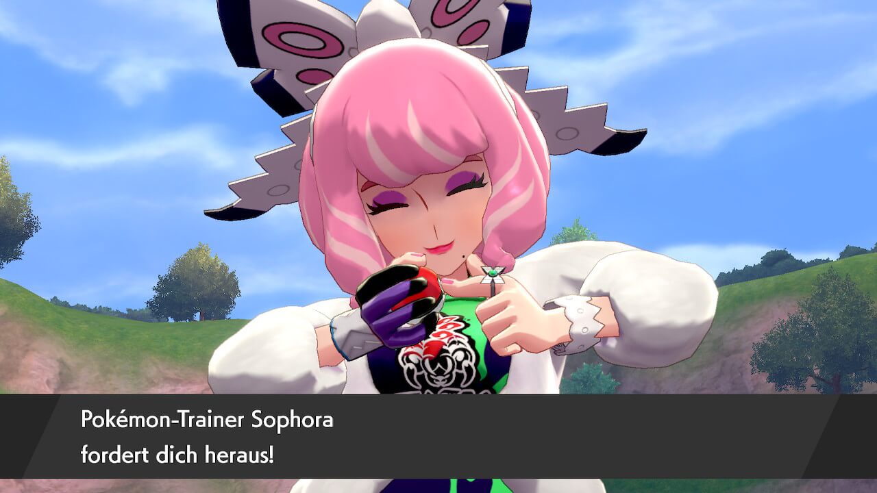 Dabei treffen wir bereits auf unseren Rivalen für das kommende Abenteuer: Sophora, eine Gift-Trainerin in Schwert oder Saverio, ein Psycho-Trainer, in Schild. Da ich aber Pokémon Schwert spiele, lernt ihr in diesem Text leider nur Sophora kennen. Die pinkhaarige Dame ist aber ein Highlight der Episode. Sie ist eine sehr ausdrucksstarke und unterhaltsame Person und ihr Gift-Team ist nicht von schlechten Eltern. Ihr Ziel ist es, irgendwann eine Gift-Arenaleiterin zu sein. Dafür zieht es sie, genau wie euch, zur Insel der Rüstung. Denn hier befindet sich ein Ort, der die besten Kämpfer der Galar-Region hervorgebracht hat: das legendäre Kampf-Dojo von Meister Mastrich.