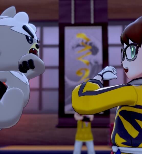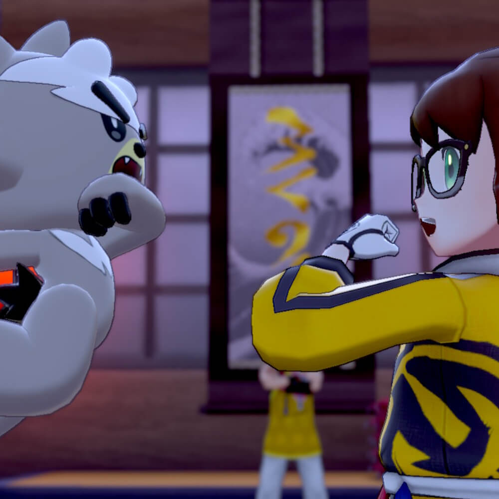 Aber kommen wir zurück zur Geschichte. Gemeinsam mit Sophora erreichen wir das Dojo, von dessen Dach uns ein kleines Hunde-Pokémon beobachtet. Begrüßt werden wir von der Frau des Meisters, Enia, die ein bisschen an Prinzessin Daisy erinnert. Im Inneren des Gebäudes werden wir von Meister Mastrich in Empfang genommen. Er ist ein lustiger alter Kauz, dessen Sprache nur so von Wortwitzen gespickt ist. Er überreicht uns feierlich unser gelbes Dojo-Outift. Doch als Sophora ihres erhalten soll, springen auf einmal drei überraschend schnelle Galar-Flegmon heran, schnappen sich die Uniform und stürmen aus dem Dojo. Der Meister schickt uns also auf unsere erste Aufgabe: die von ihm trainierten Flegmon einzuholen, sie zu besiegen und ihnen die Uniform wieder abnehmen.