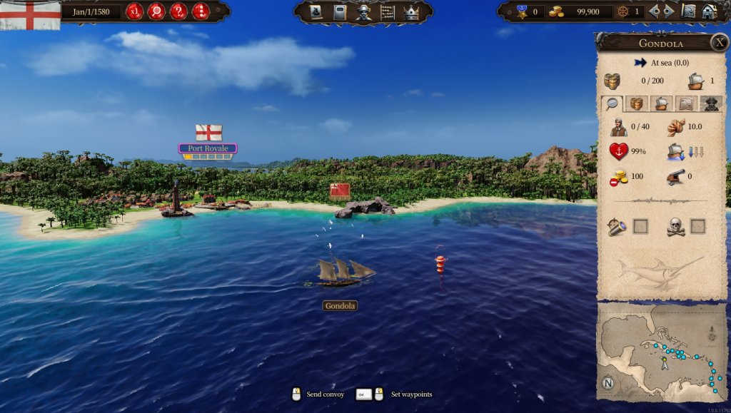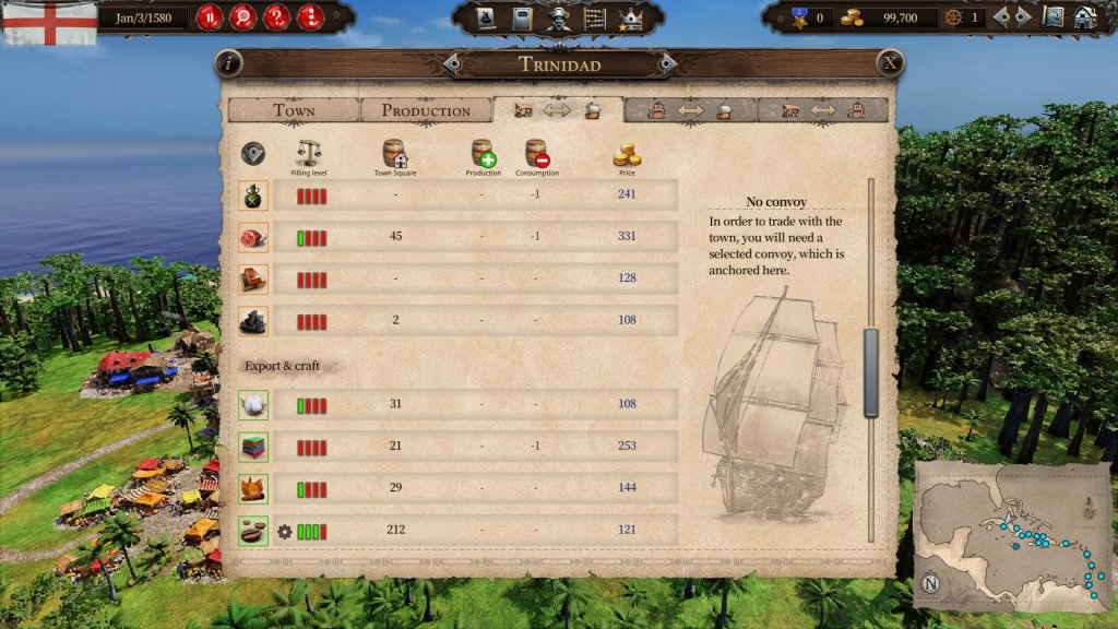 Was mir sofort negativ aufgefallen ist, als ich mit dem Test von Port Royale 4 angefangen habe, sind die Menüs. Ich habe absolut nichts dagegen mich durch viele Menüs zu klicken. Mein Lieblingsspiel dieses Jahr war Crusader Kings 3 (hier der Artikel zu diesem Strategie-Spiel) und da gibt es nochmal um einiges mehr Menüs. Aber Port Royale schafft es leider nich,t diese anschaulich zu gestalten oder sie organisch zusammen laufen zu lassen. Es fühlt sich manchmal fast wie Arbeit an, die richtige Information im richtigen Menü zu finden. Im Warenmenü wäre schon etwas Einfaches wie eine Suchleiste sehr hilfreich, um nicht ständig durch die komplette Liste scrollen zu müssen.