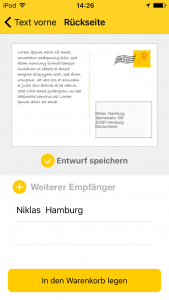 Hinter der App Funcard steckt die Deutsche Post – unschwer zu erkennen am schwarzen Posthorn und dem typischen Gelbton im Icon. Die App ist sehr übersichtlich und schlicht gestaltet, macht aber einen etwas spießigen Eindruck auf mich. Die Funktion der App ist wirklich nur auf das Gestalten und Versenden der Karte reduziert. Ihr könnt aus unzähligen Schriftarten und vielen Farben wählen. Die Vorderseite der Postkarte ist glänzend beschichtet, die Rückseite ist nicht beschichtet. Der Text ist gleichmäßig verteilt. PayPal wurde auch hier gelungen integriert, um den Bezahlvorgang zu bewerkstelligen. Für das Versenden einer Postkarte bezahlt ihr hier 1,90 Euro. Hier kommt ihr zum Download der Funcard-App im AppStore und hier zum Download der App bei Google Play.