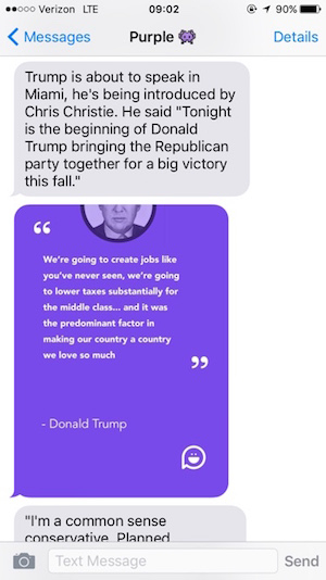 Mit Purple kommen Kurznachrichten kommen wieder in den Trend. Es handelt sich allerdings nicht um Spam-SMS, sondern gezielte Liveberichterstattung über aktuelle politische Themen. Das Startup nutzt Kurznachrichten, um seine Nutzer über den Vorwahlkampf der US-Präsidentschaftskandidaten auf dem Laufenden zu halten.