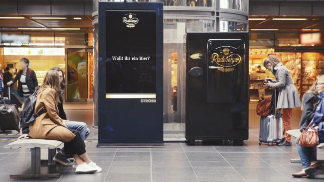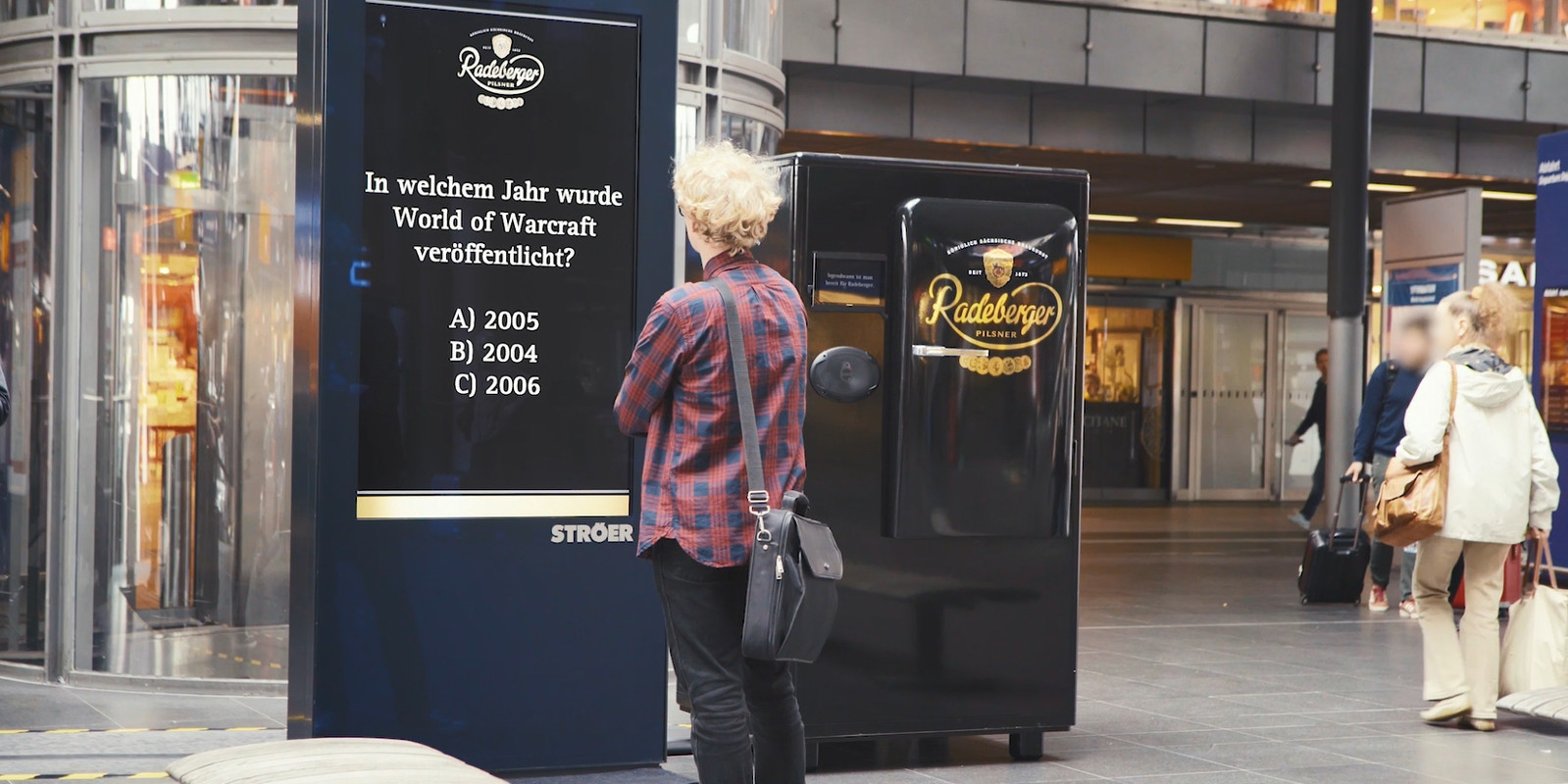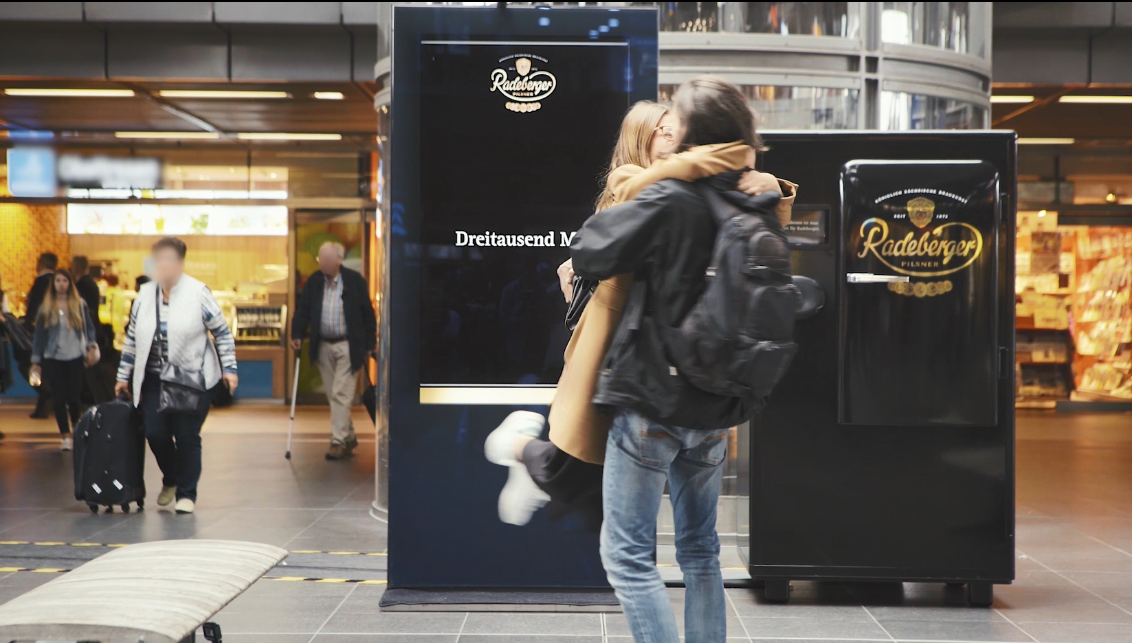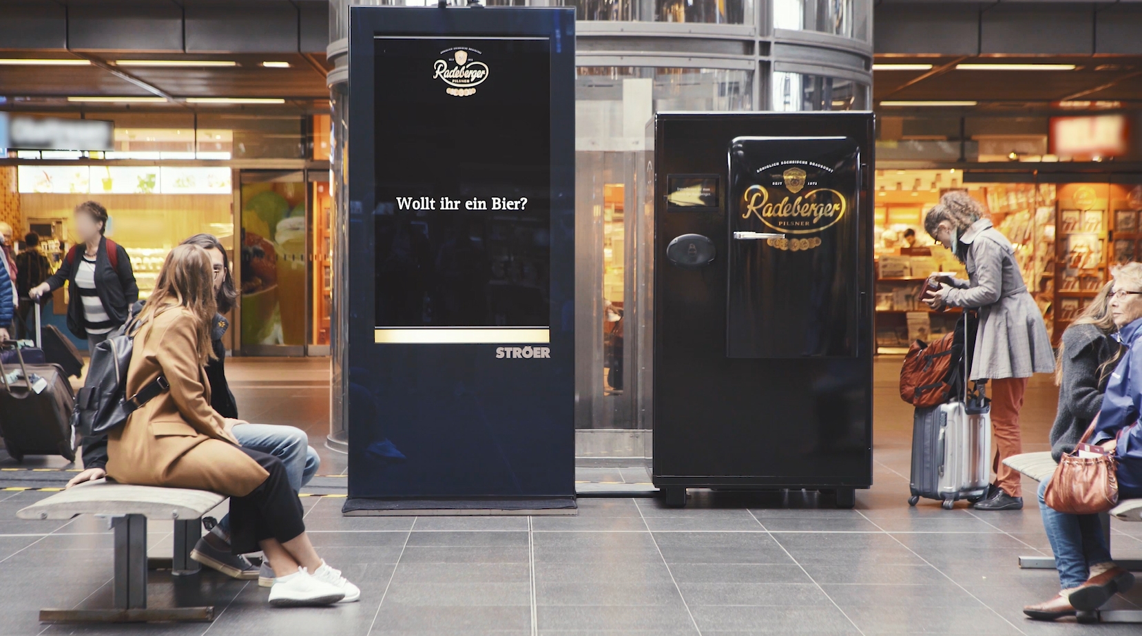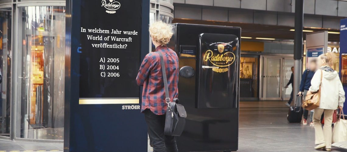 Da schaut man schon zweimal, wenn ein Kühlschrank plötzlich eine Konversation zu beginnen scheint. Per digitalem Screen kommuniziert der Retro-Kühlschrank mit den Passanten und stellt ihnen allerhand Aufgaben. Wer trinken will, kann auch arbeiten und so müssen sich die “Auswerwählten” des digitalen Radebgerer Kühlschrankes so einigen Reifeprüfungen unterziehen – tatsächlich bis hin zu einem Heiratsantrag!