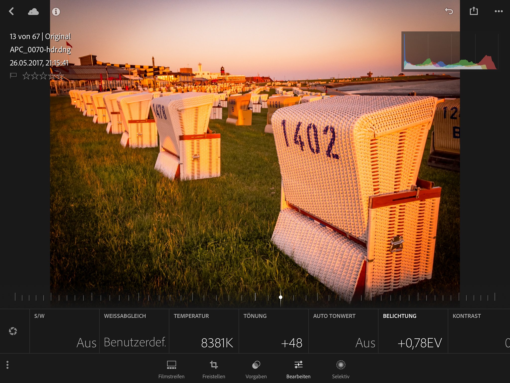 Auch der Weißabgleich lässt sich bei der Nachbearbeitung relativ gut korrigieren. Das ist praktisch, wenn ihr in Innenräumen fotografiert habt, wo viel Kunstlicht die Szenerie beleuchtet hat. Den Weißabgleich und andere Farbkorrekturen könnt ihr über das „Farbe“-Icon in Lightroom für iOS verändern. Auch bei Landschaftsfotos lohnt es sich übrigens, mit dem Weißabgleich zu experimentieren. Dies kann den Charakter eines Himmels völlig verändern und interessanter wirken lassen kann.