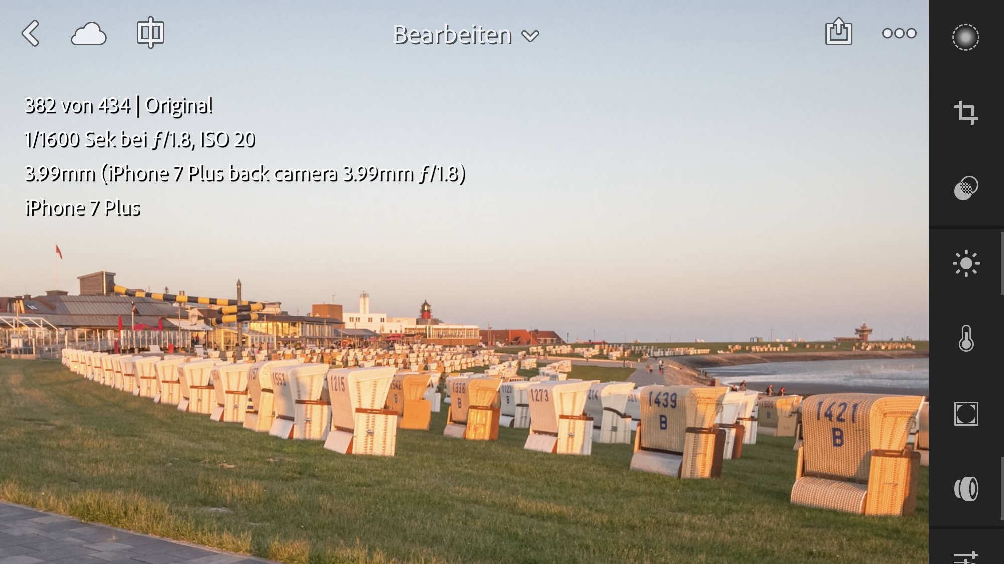 In hellen Bereichen wie Wolken könnt ihr die sogenannten Spitzlichter reduzieren, um wieder Zeichnung zu sehen, die Wolken halt so bauchig und flauschig aussehen lassen. In dunklen Teilen des Bildes könnt ihr die Schatten aufhellen, sodass Gräser oder Fassadenstrukturen wieder erkennbar sind. Mit Lightroom für iOS macht ihr dies, indem ihr ein Bild in der Einzelansicht öffnet und das „Licht“-Icon aktiviert. Dort könnt ihr an den jeweiligen Reglern die Lichter und Tiefen verändern.