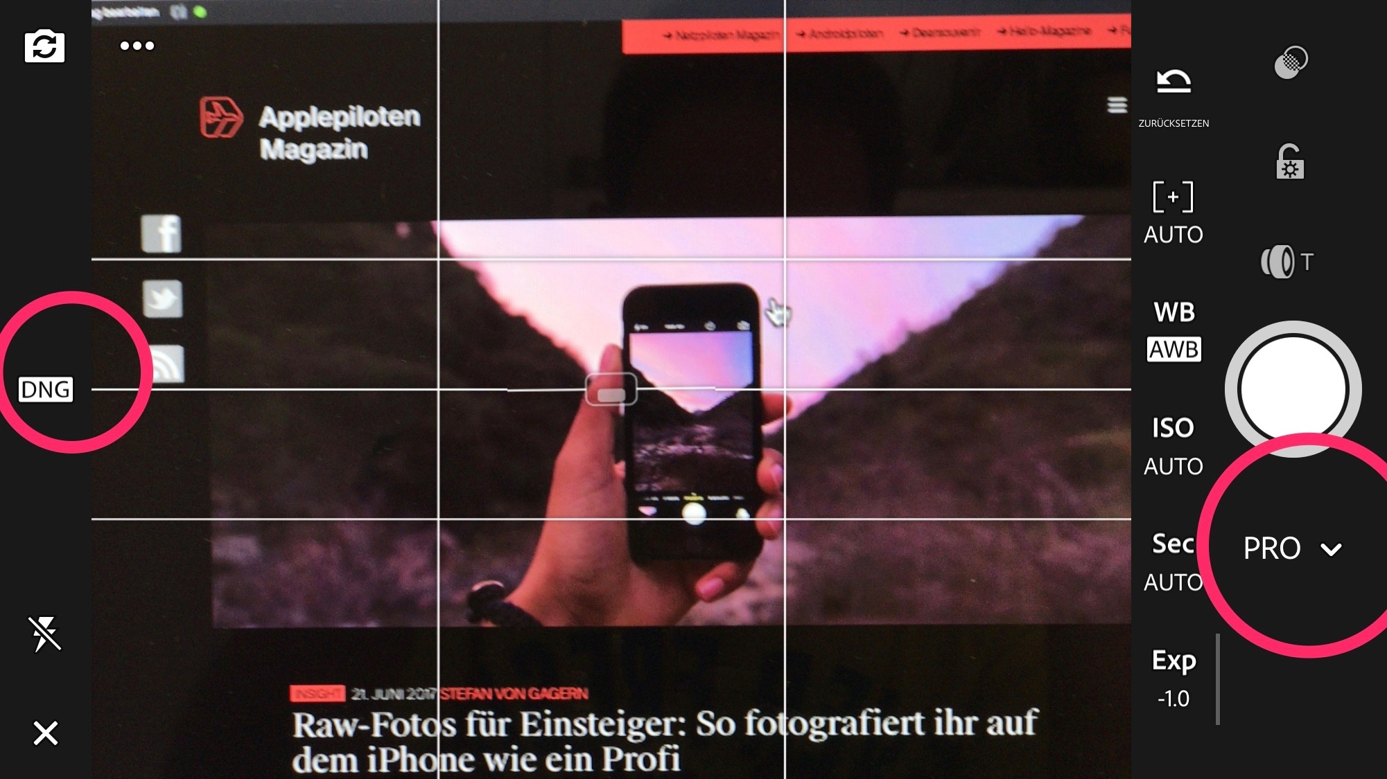 Leider lässt sich das Rohdatenformat nur über einen kleinen Umweg verwenden. Ihr braucht nämlich eine zusätzliche Kamera-App, die in Raw abspeichern kann. Dies geht zum Beispiel mit den kostenpflichtigen Apps ProCamera oder ACDSee Pro. Mit Lightroom gibt es auch eine Gratis-Alternative, für die ihr euch lediglich einen kostenlosen Adobe-Account zulegen müsst. Es genügt dabei, jeweils einen Modus zu aktivieren, der „Professionell“ oder ähnlich heißt.